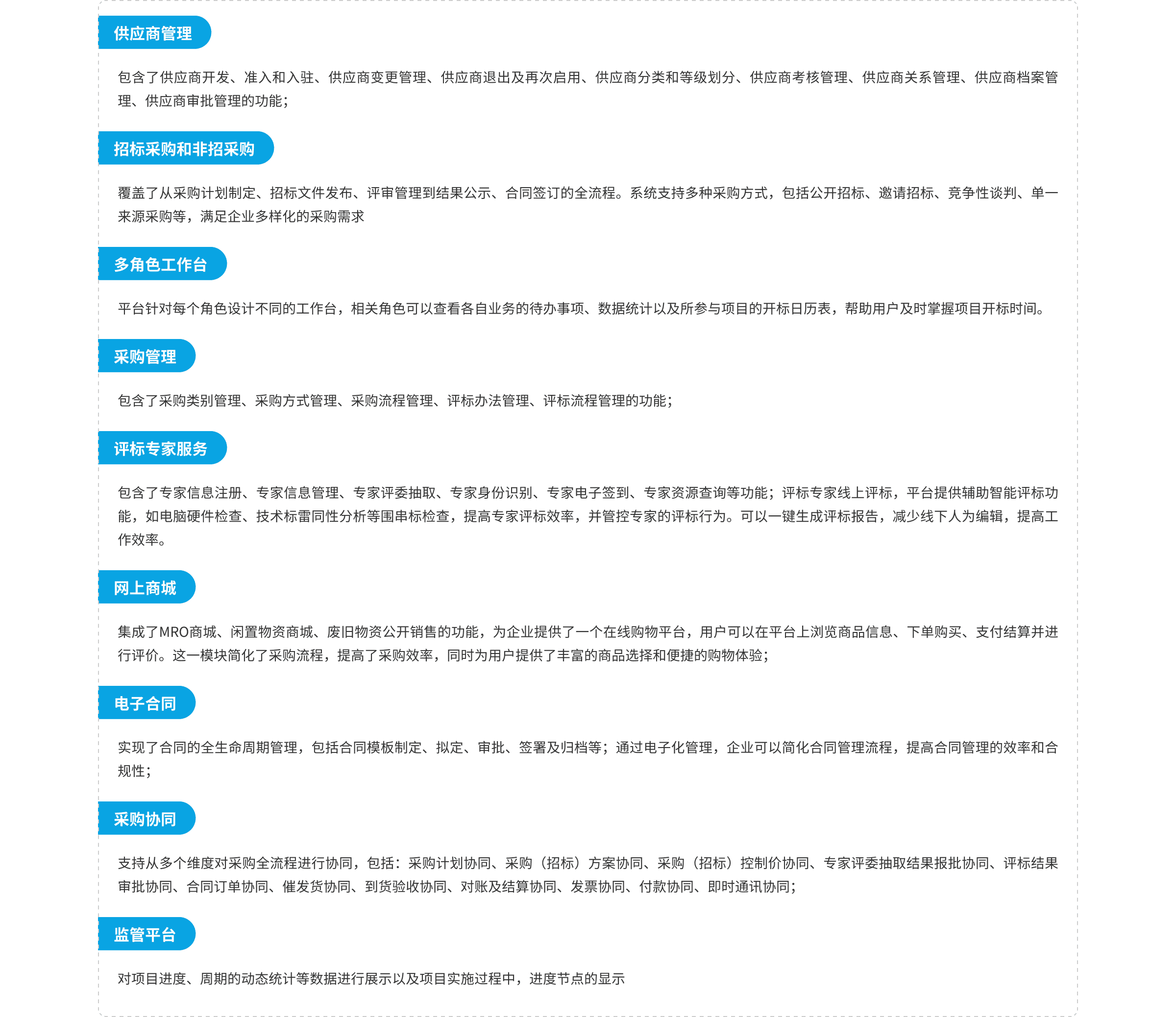 通過建設(shè)集團(tuán)數(shù)字化采購(gòu)平臺(tái),打造一個(gè)集供應(yīng)商管理、招標(biāo)采購(gòu)、非招標(biāo)采購(gòu)、網(wǎng)上商城、廢舊物資處置、電子合同(電子簽章)、供應(yīng)商協(xié)同、采購(gòu)協(xié)同、審計(jì)監(jiān)督、移動(dòng)端運(yùn)用為一體的綜合采購(gòu)管理平臺(tái)。