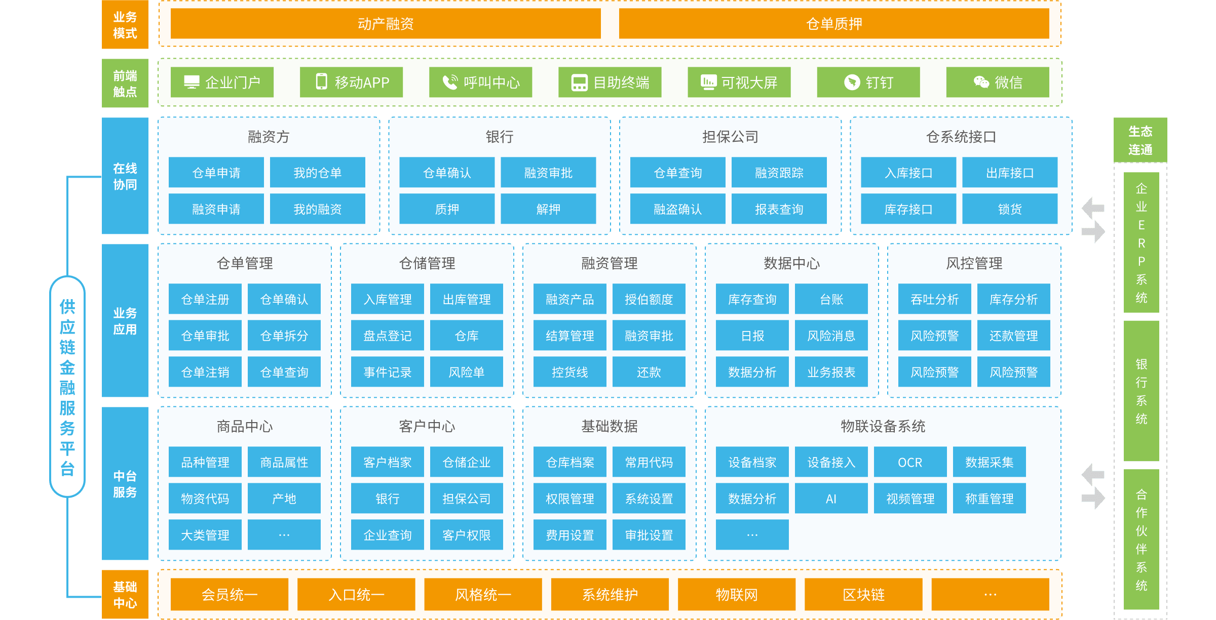 高達(dá)供應(yīng)鏈金融服務(wù)平臺(tái)實(shí)現(xiàn)供應(yīng)鏈上下游企業(yè)在線化協(xié)同服務(wù),包含倉(cāng)儲(chǔ)管理、倉(cāng)單管理、融資管理、數(shù)據(jù)中心、風(fēng)控管理、平臺(tái)支撐等功能,支持與外部倉(cāng)儲(chǔ)系統(tǒng)、貿(mào)易系統(tǒng)、銀行系統(tǒng)對(duì)接,實(shí)現(xiàn)業(yè)務(wù)及數(shù)據(jù)的互聯(lián)互通。