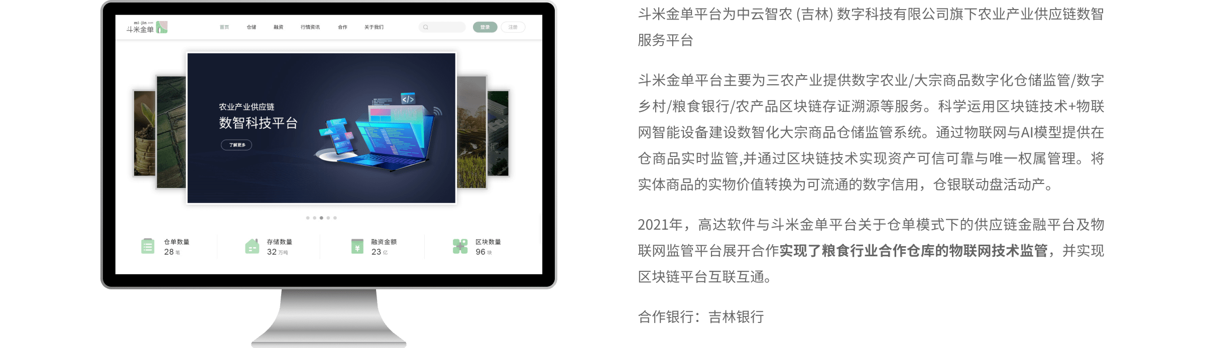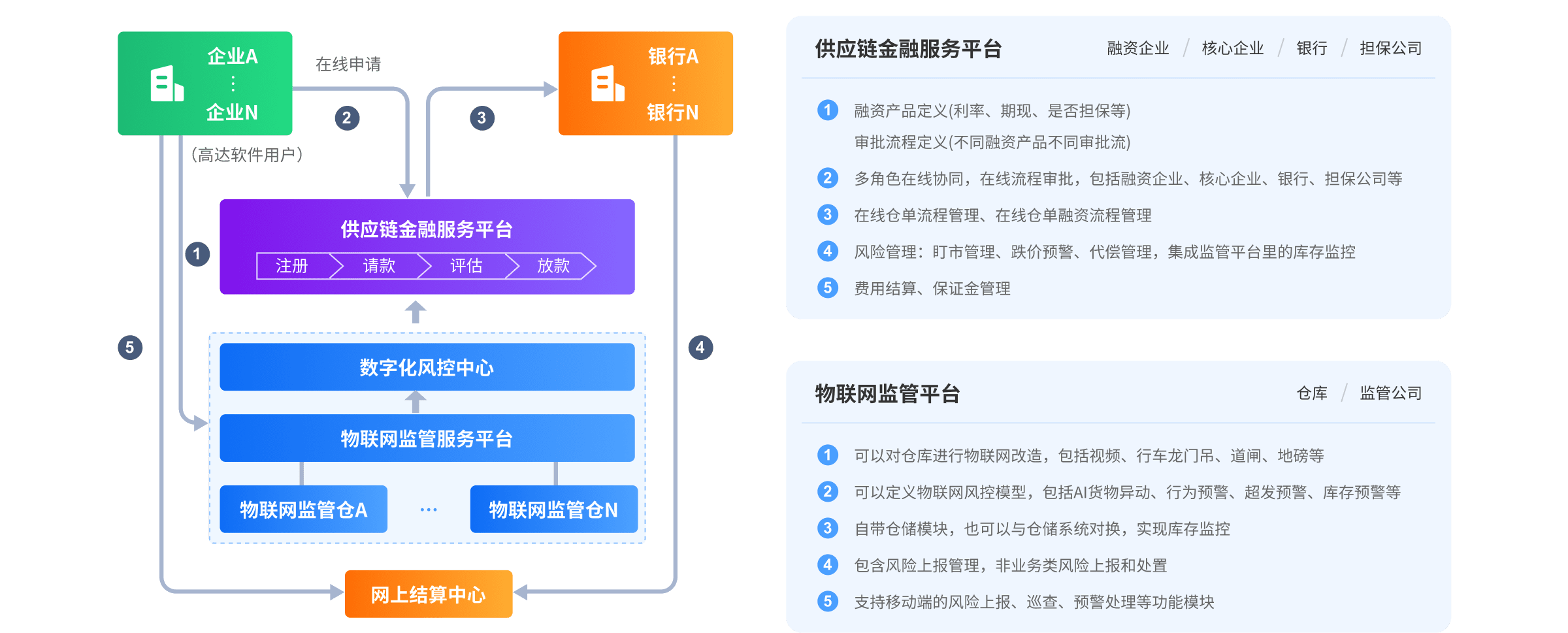 高達(dá)供應(yīng)鏈金融服務(wù)平臺(tái)為融資方、資金方、擔(dān)保方、監(jiān)管方提供多角色、在線化的供應(yīng)鏈金融協(xié)同服務(wù),支持為園區(qū)、核心企業(yè)、銀行提供私有化部署,實(shí)現(xiàn)倉(cāng)單融資過(guò)程數(shù)字化、物聯(lián)網(wǎng)化的風(fēng)控管理。