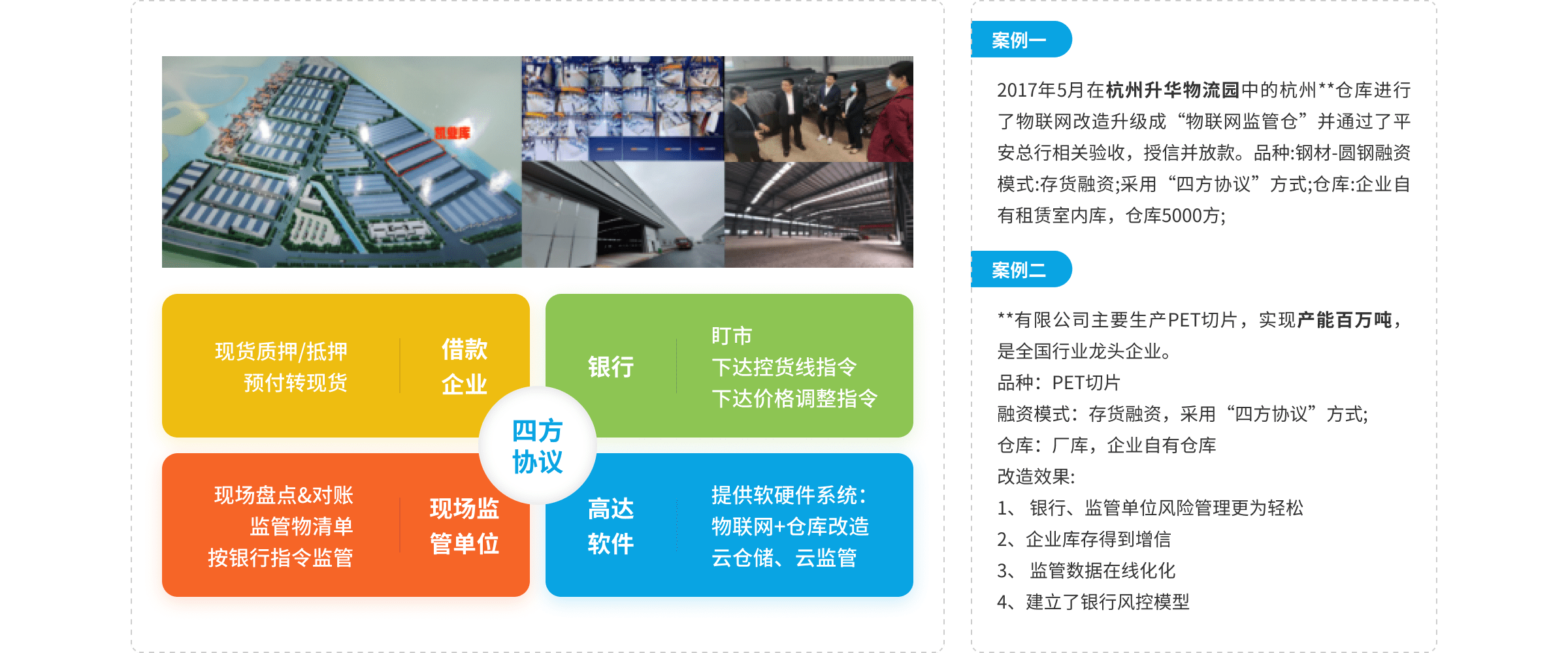 2017年4月平安銀行總行與高達(dá)軟件簽訂物聯(lián)網(wǎng)金融合作框架協(xié)議,為了推動(dòng)物聯(lián)網(wǎng)金融合作深入發(fā)展,雙方一致同意協(xié)同合作的工作機(jī)制,共建合作品牌,推動(dòng)中國(guó)物聯(lián)網(wǎng)金融的發(fā)展。并在鋼鐵、塑料等行業(yè)成功放款。部分案例情況如下: