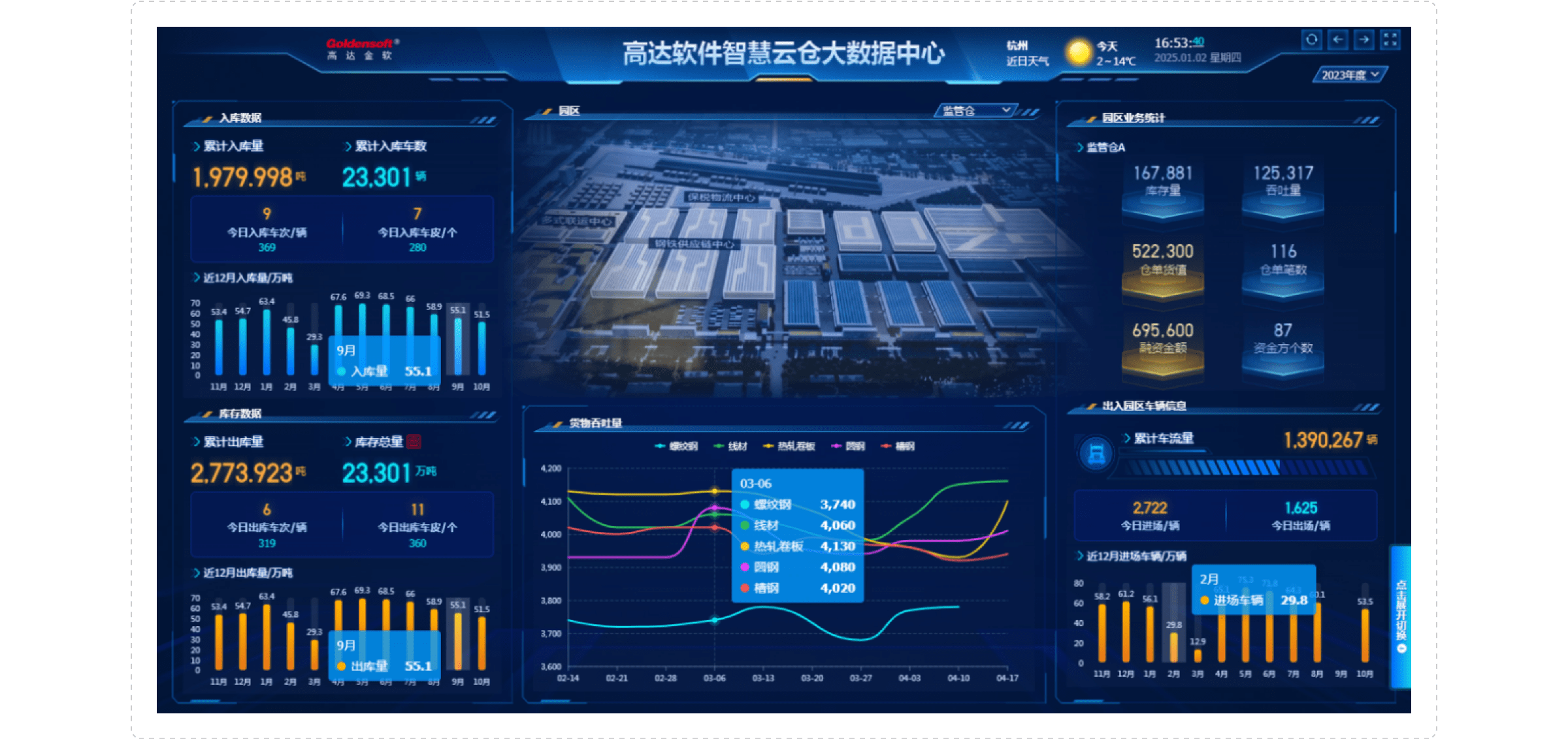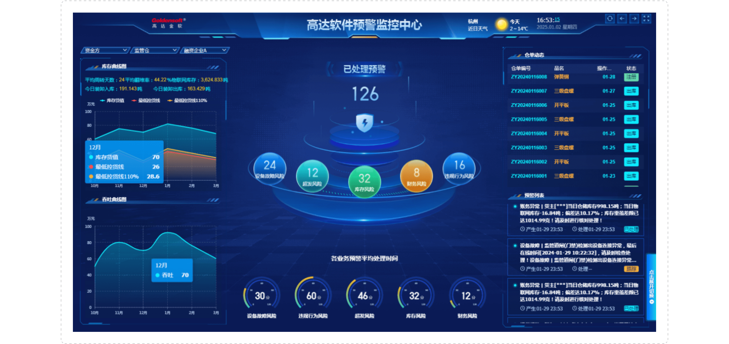 圍繞在線供應(yīng)鏈金融服務(wù)要求打造的高達(dá)數(shù)字決策駕駛艙,擁有完備的業(yè)務(wù)數(shù)據(jù)分析和風(fēng)險(xiǎn)監(jiān)管的強(qiáng)大展示功能,深度嵌入供應(yīng)鏈各環(huán)節(jié),支持提供直觀的7*24h實(shí)時(shí)融資業(yè)務(wù)數(shù)據(jù)展示、1:1還原動(dòng)產(chǎn)監(jiān)管場(chǎng)景的數(shù)字倉(cāng)庫(kù)可視化方式,同時(shí)支持前臺(tái)告警。高達(dá)數(shù)字決策駕駛艙為用戶提供集中式業(yè)務(wù)管控、戰(zhàn)略決策和風(fēng)險(xiǎn)控制方案。