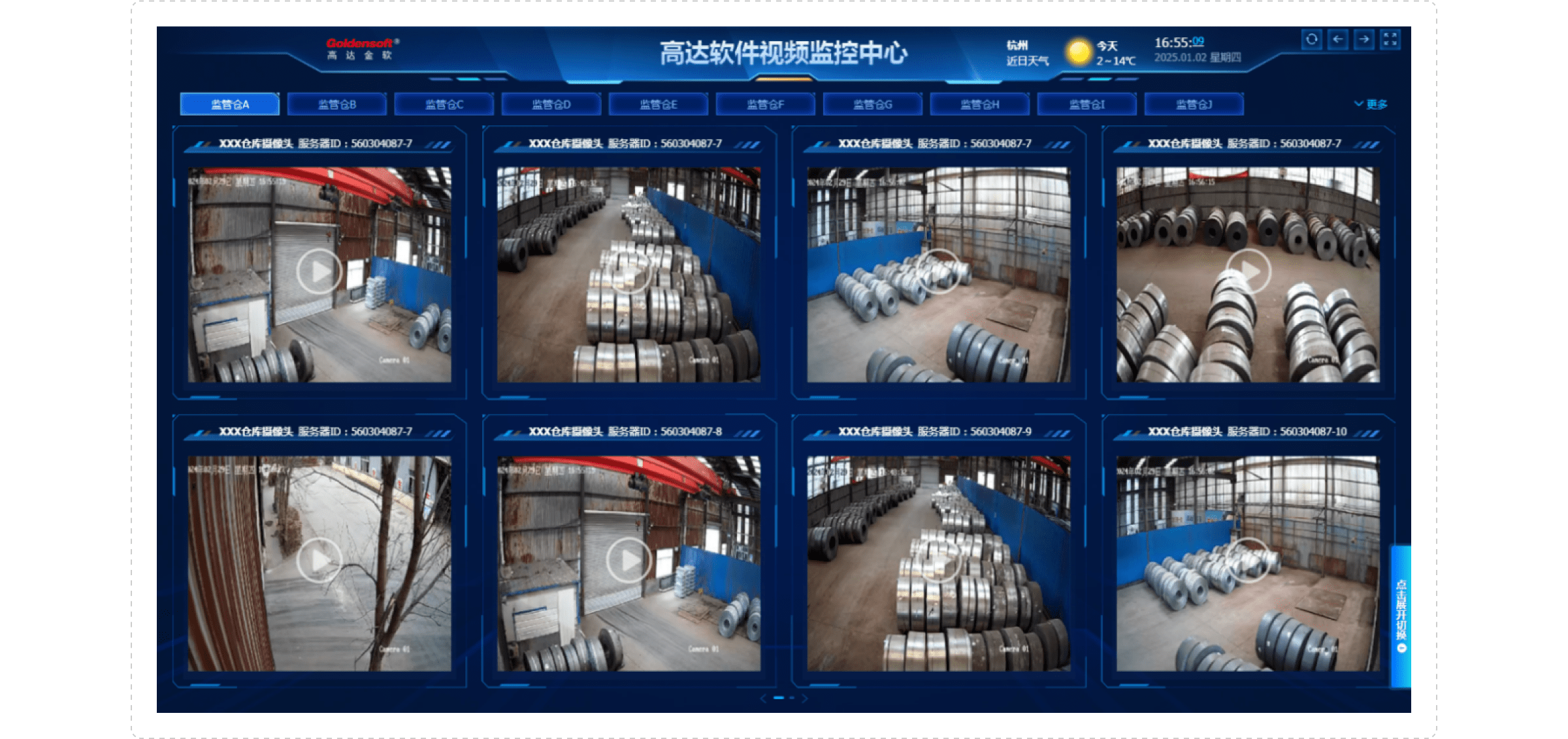 基于管理者在資產(chǎn)監(jiān)管方面的遠(yuǎn)程管控、多倉(cāng)集中管控、行為可視化和風(fēng)險(xiǎn)存證追溯的需求,提供視頻監(jiān)控中心看板。支持在一個(gè)統(tǒng)一入口對(duì)客戶監(jiān)管的全國(guó)多地多個(gè)倉(cāng)庫(kù)進(jìn)行實(shí)時(shí)視頻流拉取和集中前端可視。前端看板支持多倉(cāng)切換、實(shí)時(shí)直播功能(后臺(tái)提供歷史視頻查看),為管理者提供直觀、集中的管理效能。