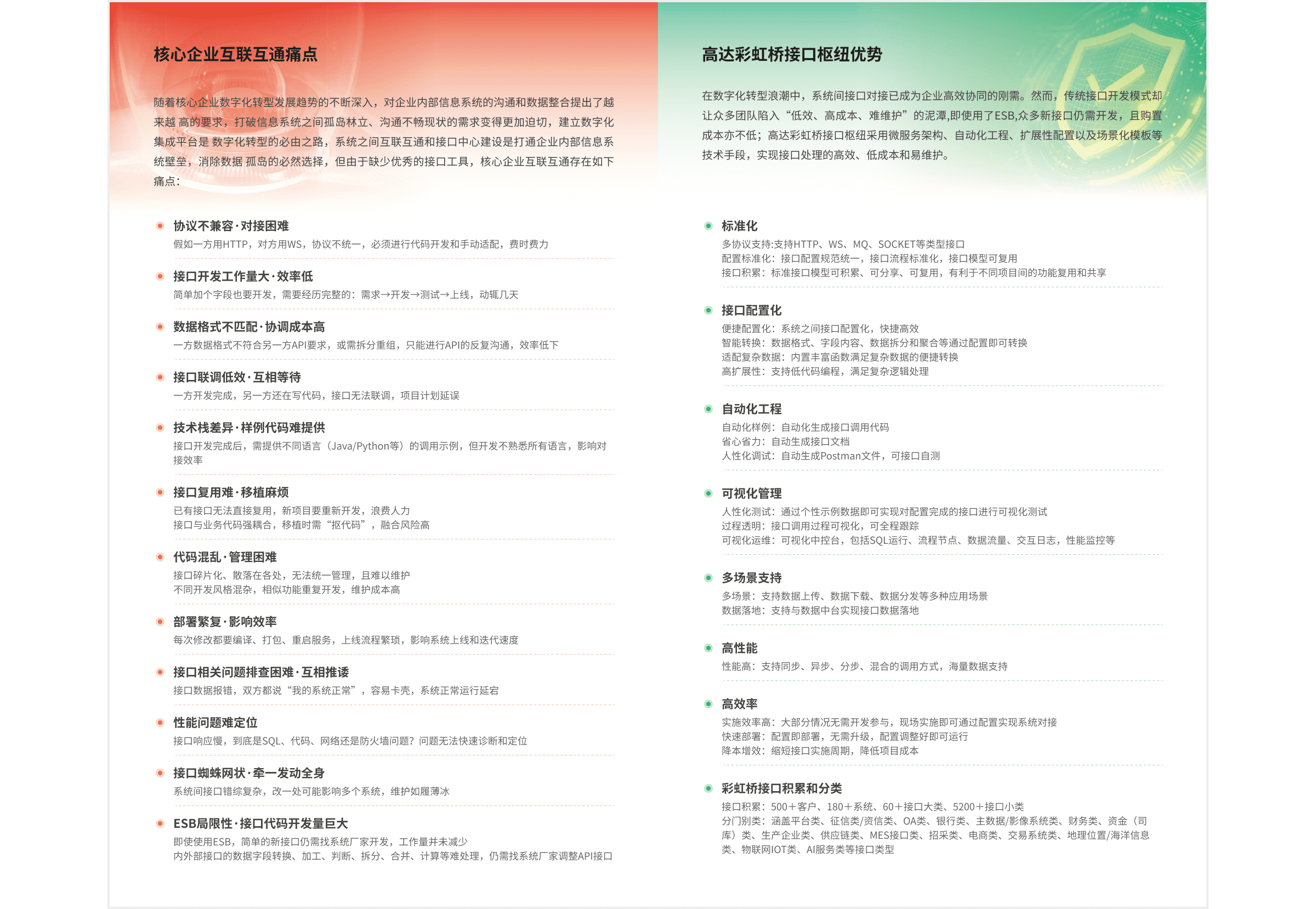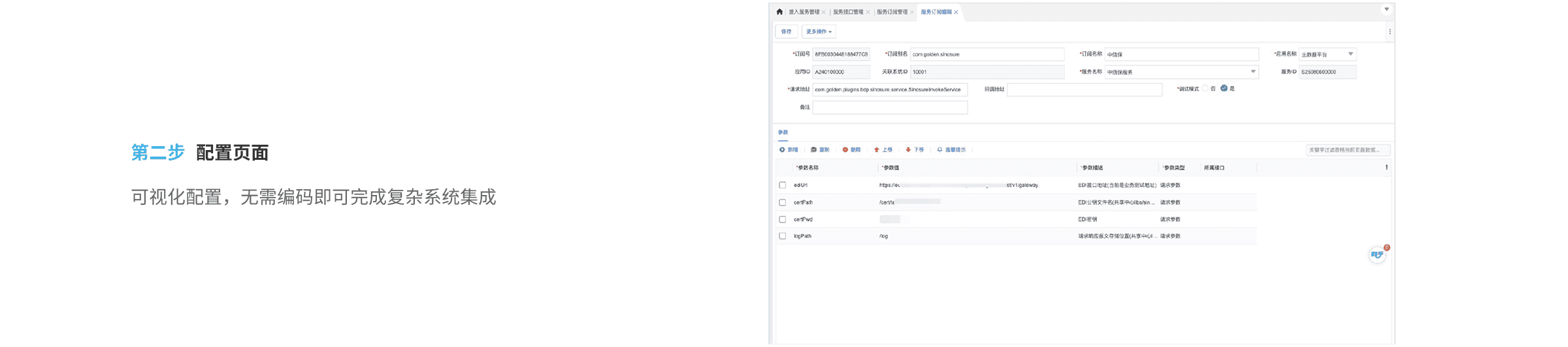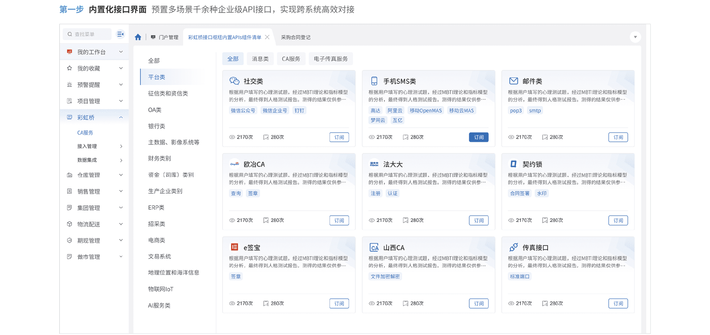 彩虹橋預(yù)置了豐富的接口模板,通過(guò)開(kāi)關(guān)啟停和配置參數(shù)微調(diào)即可實(shí)現(xiàn)內(nèi)置化接口的快速實(shí)施。