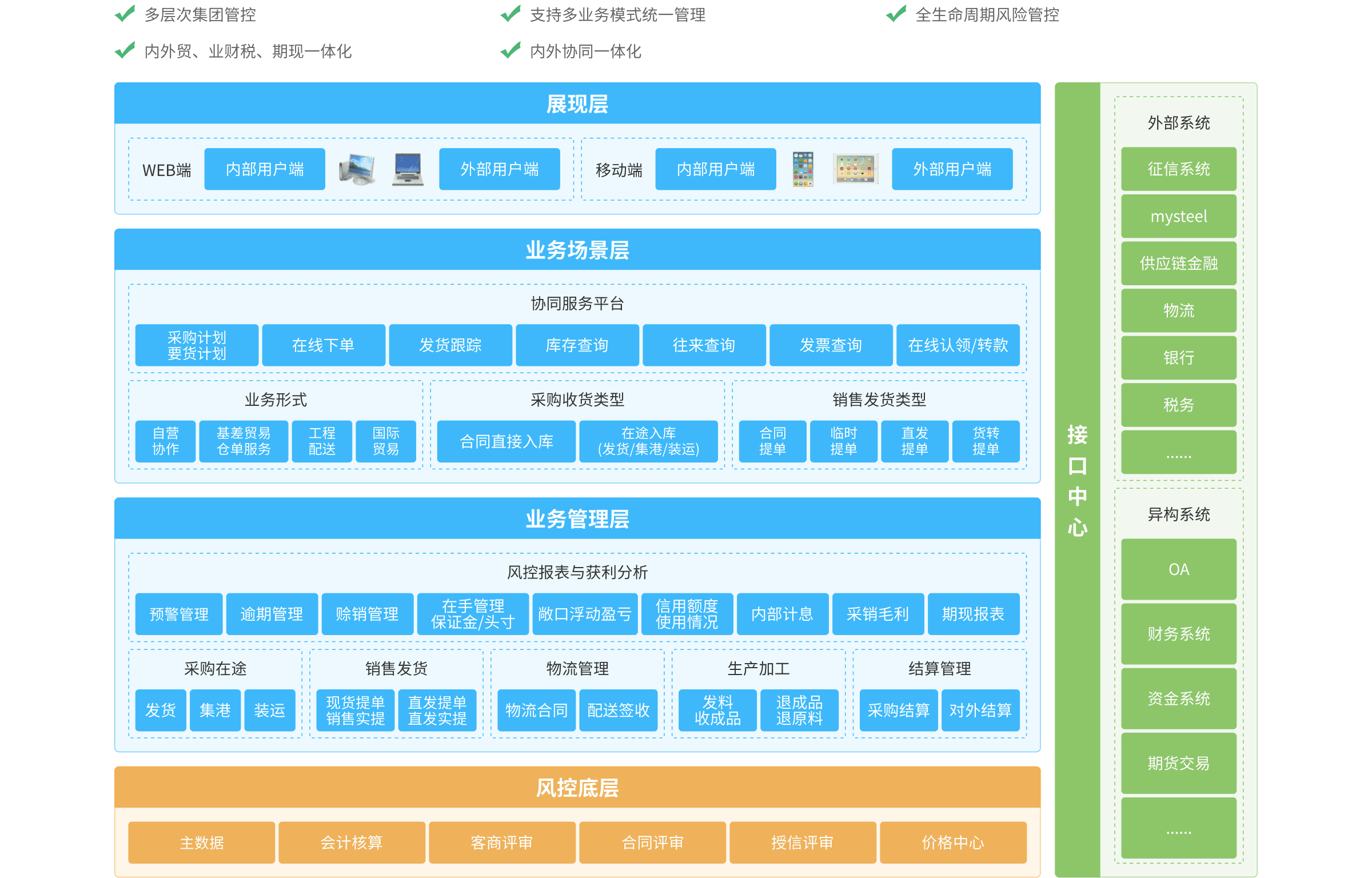 廣物金屬產(chǎn)業(yè)集團(tuán)以數(shù)字供應(yīng)鏈服務(wù)平臺(tái)頂層設(shè)計(jì)為依據(jù)搭建智慧供應(yīng)鏈系統(tǒng),同時(shí)建設(shè)主數(shù)據(jù)中心、客商中心、合同中心,與內(nèi)外部系統(tǒng)實(shí)現(xiàn)數(shù)據(jù)對(duì)接,以打造集團(tuán)化管控體系、全流程供應(yīng)鏈管理、多業(yè)務(wù)模式管理、全周期風(fēng)險(xiǎn)管控、業(yè)務(wù)財(cái)務(wù)一體化、互聯(lián)互通為建設(shè)目標(biāo),同時(shí)支持后續(xù)拓展供應(yīng)鏈綜合服務(wù)生態(tài)。