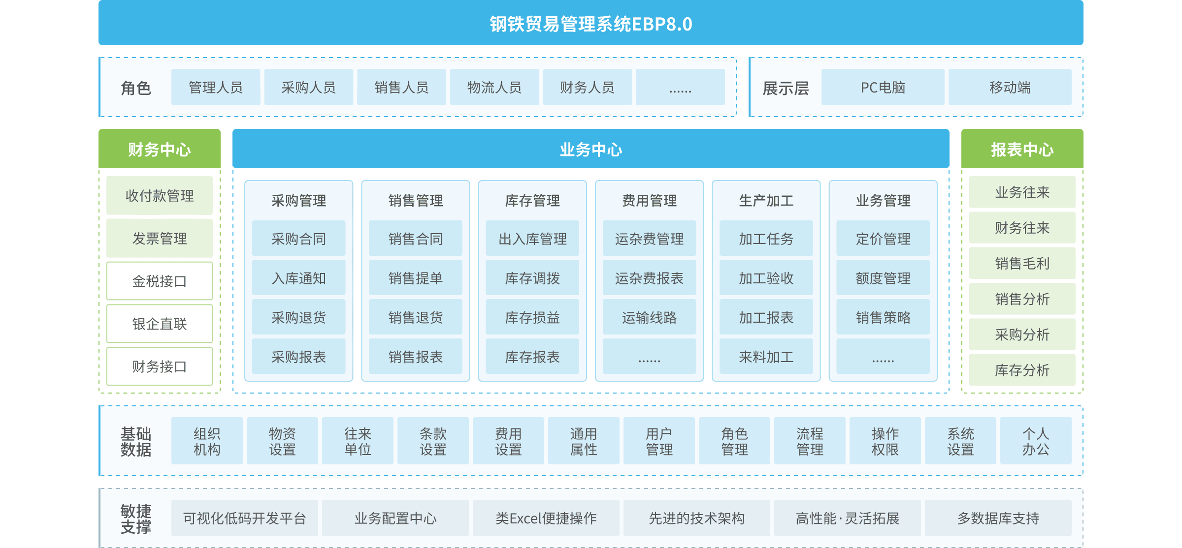 高達(dá)鋼鐵貿(mào)易管理系統(tǒng)GoldenEBP V8.0(以下簡(jiǎn)稱為EBP8.0),是高達(dá)軟件傾力打造的一款在鋼鐵貿(mào)易領(lǐng)域處于領(lǐng)先地位的數(shù)字化管理系統(tǒng)。EBP8.0系統(tǒng)基于當(dāng)前先進(jìn)的SpringCloud技術(shù)架構(gòu),借助高達(dá)谷神低碼開(kāi)發(fā)平臺(tái)構(gòu)建而成。該系統(tǒng)在原EBP6.5產(chǎn)品的基礎(chǔ)上,進(jìn)行了全面的重構(gòu)和優(yōu)化,具備功能全面、性能卓越、穩(wěn)定性優(yōu)秀、擴(kuò)展性強(qiáng)以及操作簡(jiǎn)便快捷等顯著優(yōu)勢(shì)。EBP8.0系統(tǒng)全面覆蓋鋼貿(mào)企業(yè)的采購(gòu)、銷售、庫(kù)存、資金和發(fā)票等全業(yè)務(wù)場(chǎng)景,提供高效的管理和優(yōu)化解決方案,幫助企業(yè)提升運(yùn)營(yíng)效率和競(jìng)爭(zhēng)力。EBP8.0系統(tǒng)不僅簡(jiǎn)化了復(fù)雜的業(yè)務(wù)流程,還通過(guò)智能數(shù)據(jù)分析支持企業(yè)做出更明智的決策。