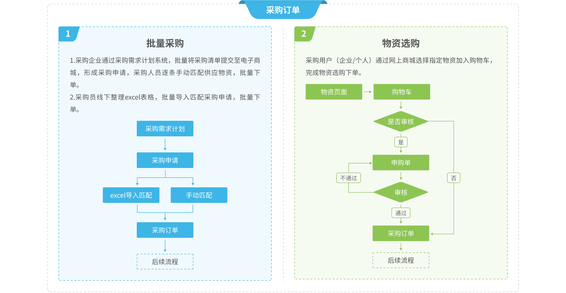電子商城:批量采購,采購商上傳采購單,商品自動(dòng)匹配商城內(nèi)無所需商品時(shí),采購商提出采購需求。