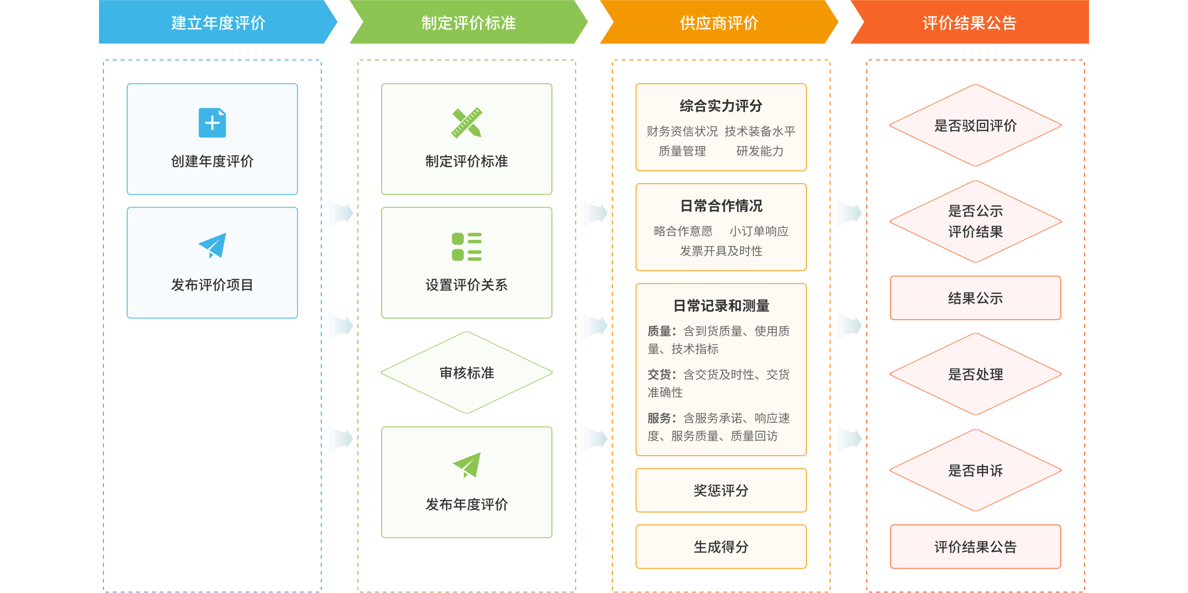 通過供應(yīng)商評價(jià)加強(qiáng)集團(tuán)管理的控制方式和抓手,以階段性的評價(jià)體系、完備有效的評價(jià)模板規(guī)則設(shè)置、評價(jià)關(guān)系管理、價(jià)項(xiàng)目管理、獎(jiǎng)懲機(jī)制、評價(jià)結(jié)果公示、評價(jià)結(jié)果申述和評價(jià)結(jié)果在平臺(tái)發(fā)布等功能,實(shí)現(xiàn)全面監(jiān)管評價(jià)進(jìn)度、全方位對集團(tuán)內(nèi)部供應(yīng)商進(jìn)行全生命周期的精細(xì)化管理。