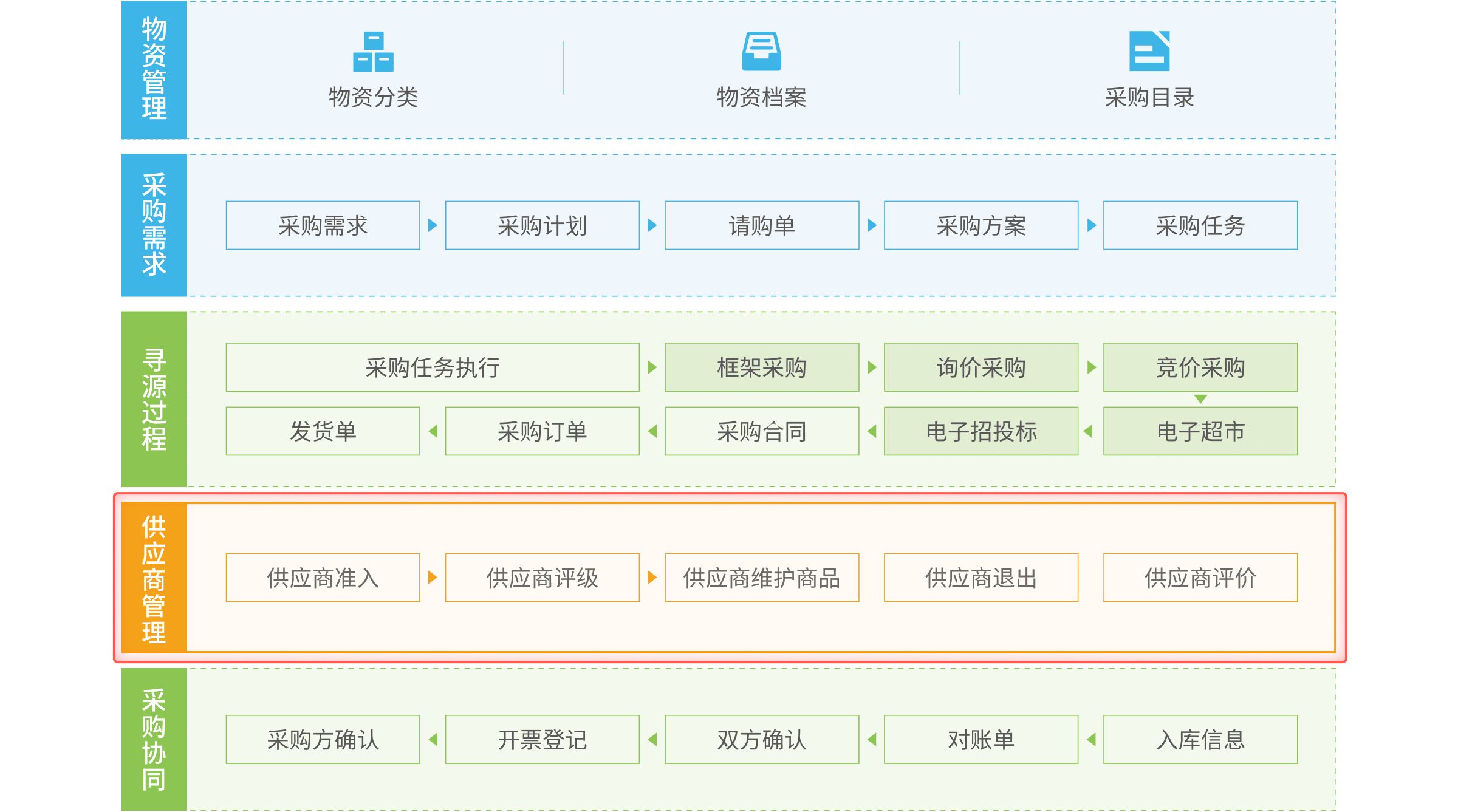 業(yè)務(wù)功能全覆蓋:供應(yīng)商管理、需求提報(bào)管理、集采管理(電子招投標(biāo)、商品詢價(jià)、服務(wù)詢價(jià)、框架協(xié)議采購、競爭性談判采購、競價(jià)采購、網(wǎng)上超市、廢舊物資處置)、合同管理、審計(jì)監(jiān)察、大數(shù)據(jù)分析、云倉儲(chǔ)、云物流平臺(tái)等功能。