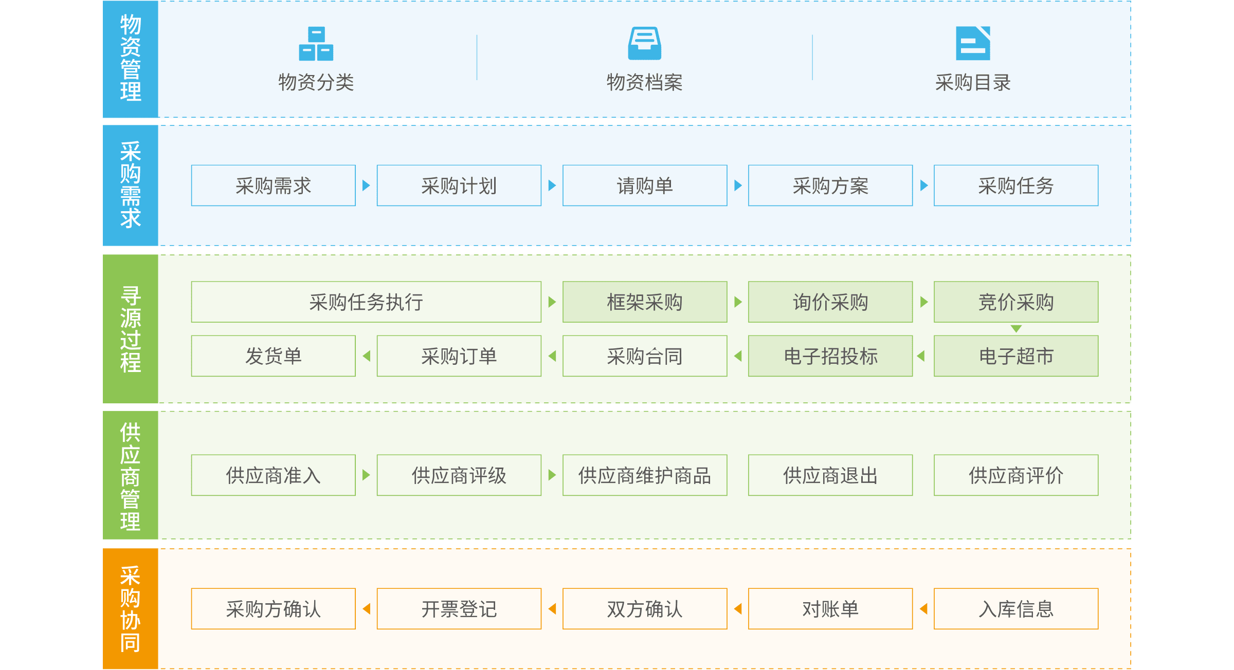 業(yè)務(wù)功能全覆蓋:供應(yīng)商管理、需求提報(bào)管理、集采管理(電子招投標(biāo)、商品詢價(jià)、服務(wù)詢價(jià)、框架協(xié)議采購、競爭性談判采購、競價(jià)采購、網(wǎng)上超市、廢舊物資處置)、合同管理、審計(jì)監(jiān)察、大數(shù)據(jù)分析、云倉儲、云物流平臺等功能。