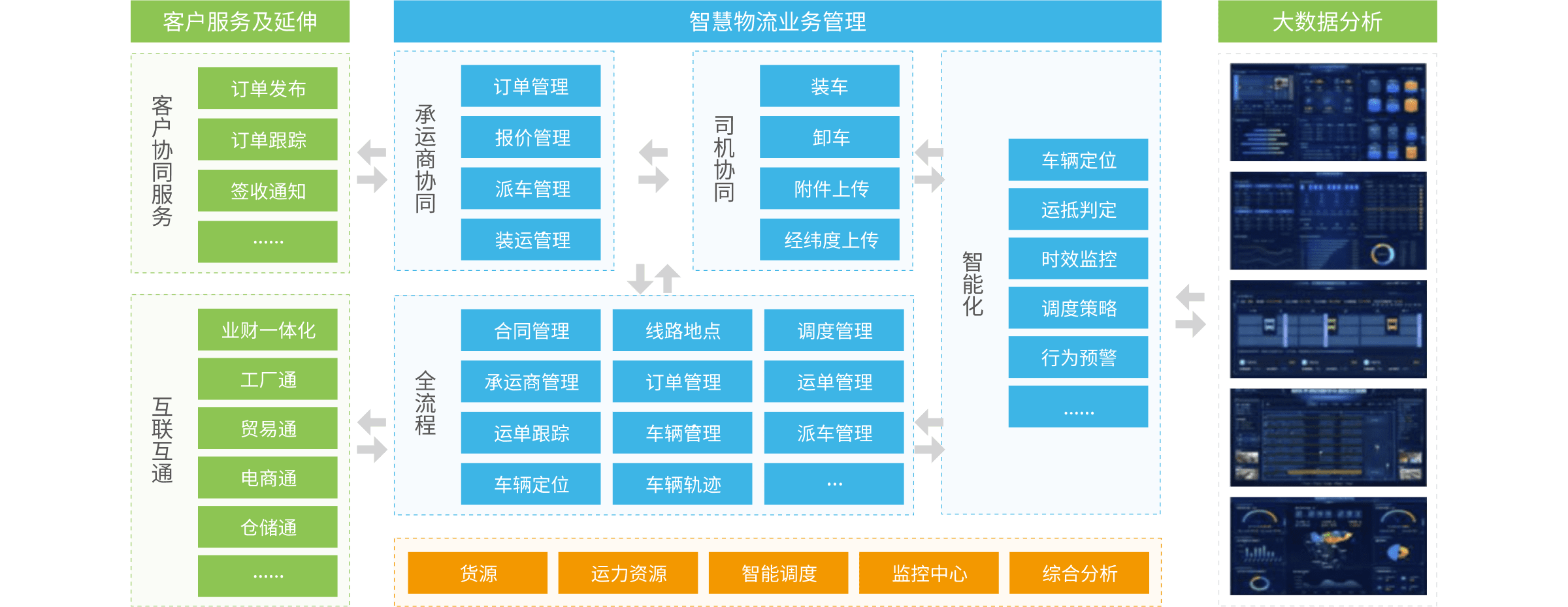高達(dá)智慧物流管理系統(tǒng)基于行業(yè)領(lǐng)先的“6+1+N”微服務(wù)架構(gòu)設(shè)計,集成智能報表、Iot物聯(lián)技術(shù)、GIS技術(shù)、電子圍欄、智能語音、智慧視頻、大數(shù)據(jù)技術(shù)、數(shù)字孿生、RPA和AI等人工智能技術(shù),是一套專業(yè)的大宗商品物流管理平臺,提供從客商、運力、合同、訂單、承運、配載、派車、裝運、跟蹤、返單結(jié)算、車輛管理等全流程的數(shù)字化管理,結(jié)合北斗/GPS定位實現(xiàn)車輛定位、歷史軌跡、時效監(jiān)控、運抵判定、智能調(diào)度等智能化應(yīng)用。支持多終端應(yīng)用包括管理PC端、委托單位PC端、承運單位PC端、司機(jī)移動端、智慧大屏和大數(shù)據(jù)模型等多角色協(xié)同,實現(xiàn)物流業(yè)務(wù)在線化、可視化、可跟蹤、可追溯的運營目標(biāo)。