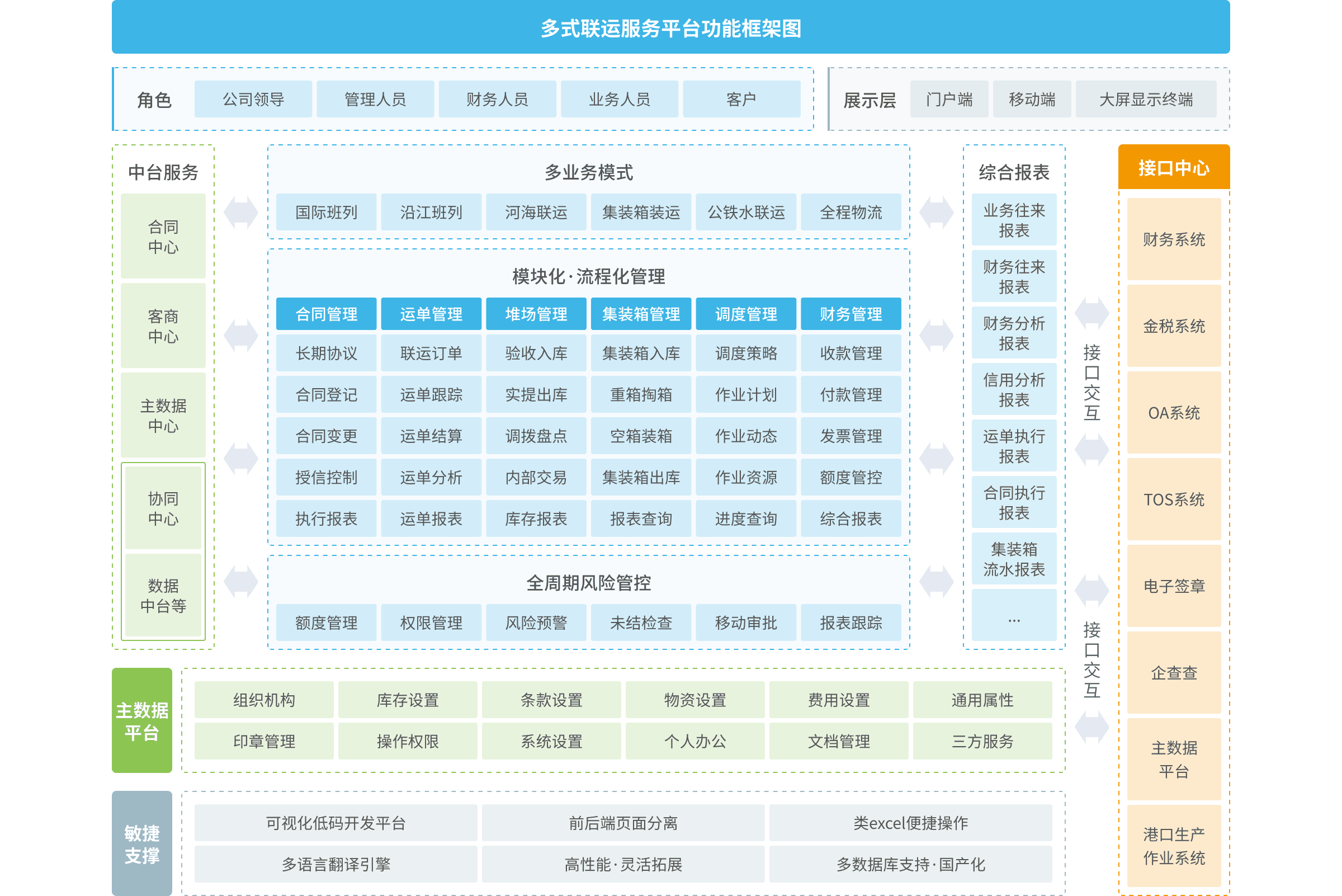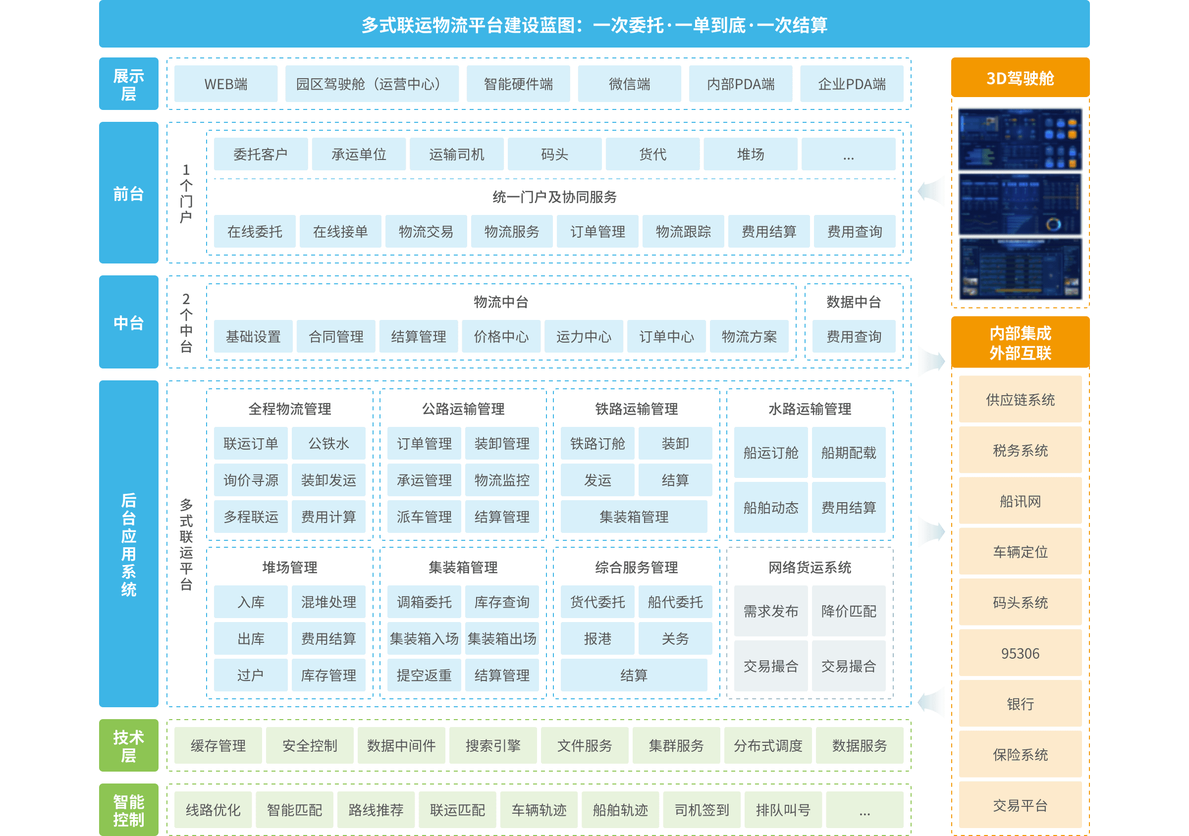 多式聯(lián)運(yùn)平臺(tái)的建設(shè)包括協(xié)同中心、訂單中心、調(diào)度中心、運(yùn)單管理、集裝箱管理、物流監(jiān)控中心、結(jié)算管理以及貨代、合同、堆場(chǎng)管理等模塊配套。前臺(tái)提供給委托單位、物流供應(yīng)商一個(gè)在線化的協(xié)同平臺(tái),可在線訂艙、在線委托、在線訂單跟蹤以及物流公司的在線接單、在線派單等功能;后臺(tái)實(shí)現(xiàn)多式聯(lián)運(yùn)訂單管理、調(diào)度、運(yùn)單、結(jié)算等全過程的“一單制、一票制、一箱制”業(yè)務(wù)管控。