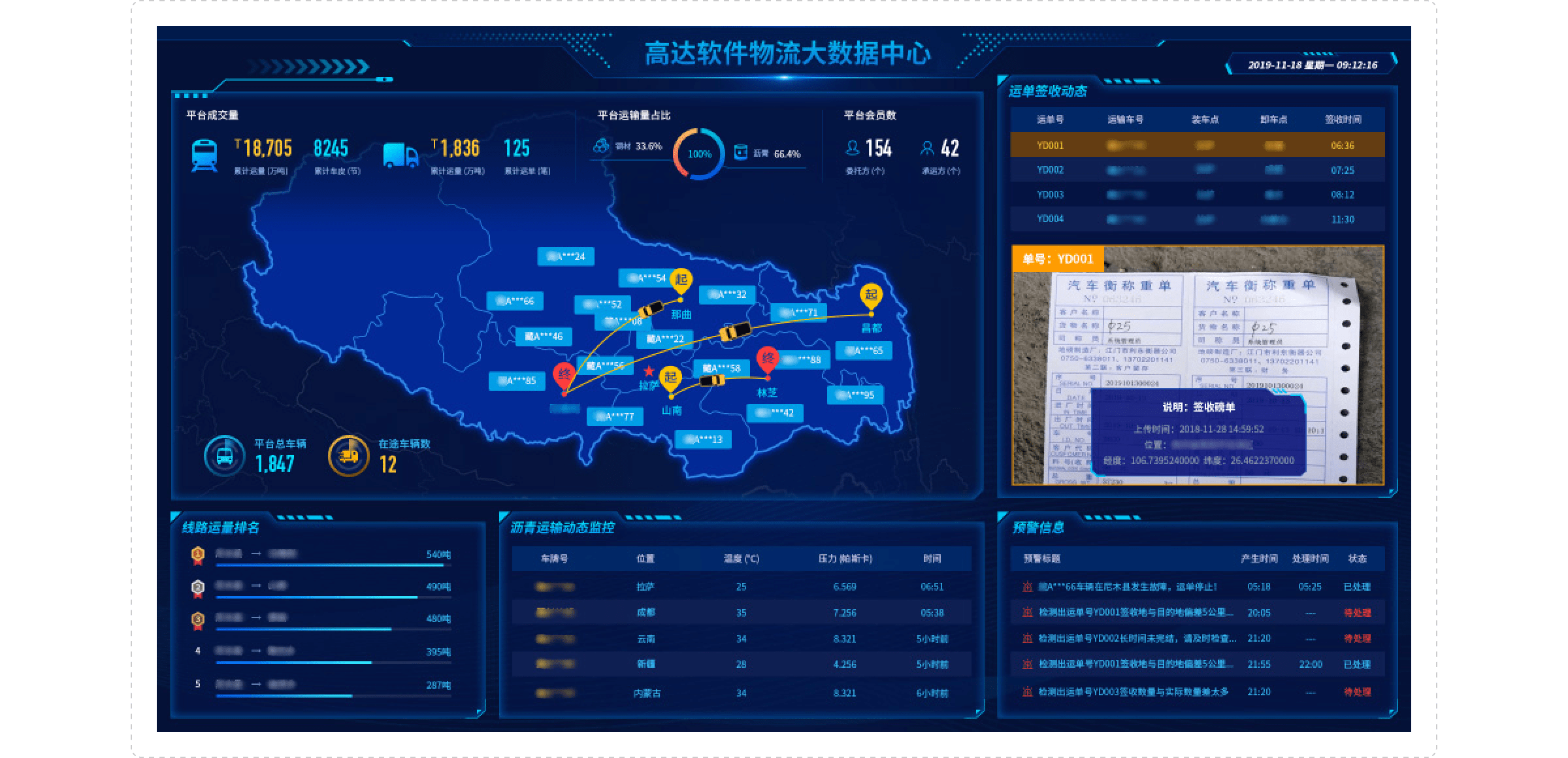 物流大數(shù)據(jù)中心完成對物流調(diào)度和運輸過程的實時監(jiān)管,實現(xiàn)從物流運營的整體健康狀況到具體的運單流轉(zhuǎn)細(xì)節(jié),提供場景化的運輸行為數(shù)據(jù)可視,展示數(shù)據(jù)包括:通過對平臺運輸量統(tǒng)計、各類運輸方式占比分析、活躍會員數(shù)量統(tǒng)計、熱門運輸線路運量排名、車輛實時動態(tài)軌跡追蹤、運單簽收狀態(tài)即時更新以及潛在的運輸風(fēng)險等,為物流管理決策者提供更為精準(zhǔn)的管理介入點和措施實施的時間契機(jī),從而優(yōu)化整體物流效率與服務(wù)質(zhì)量。