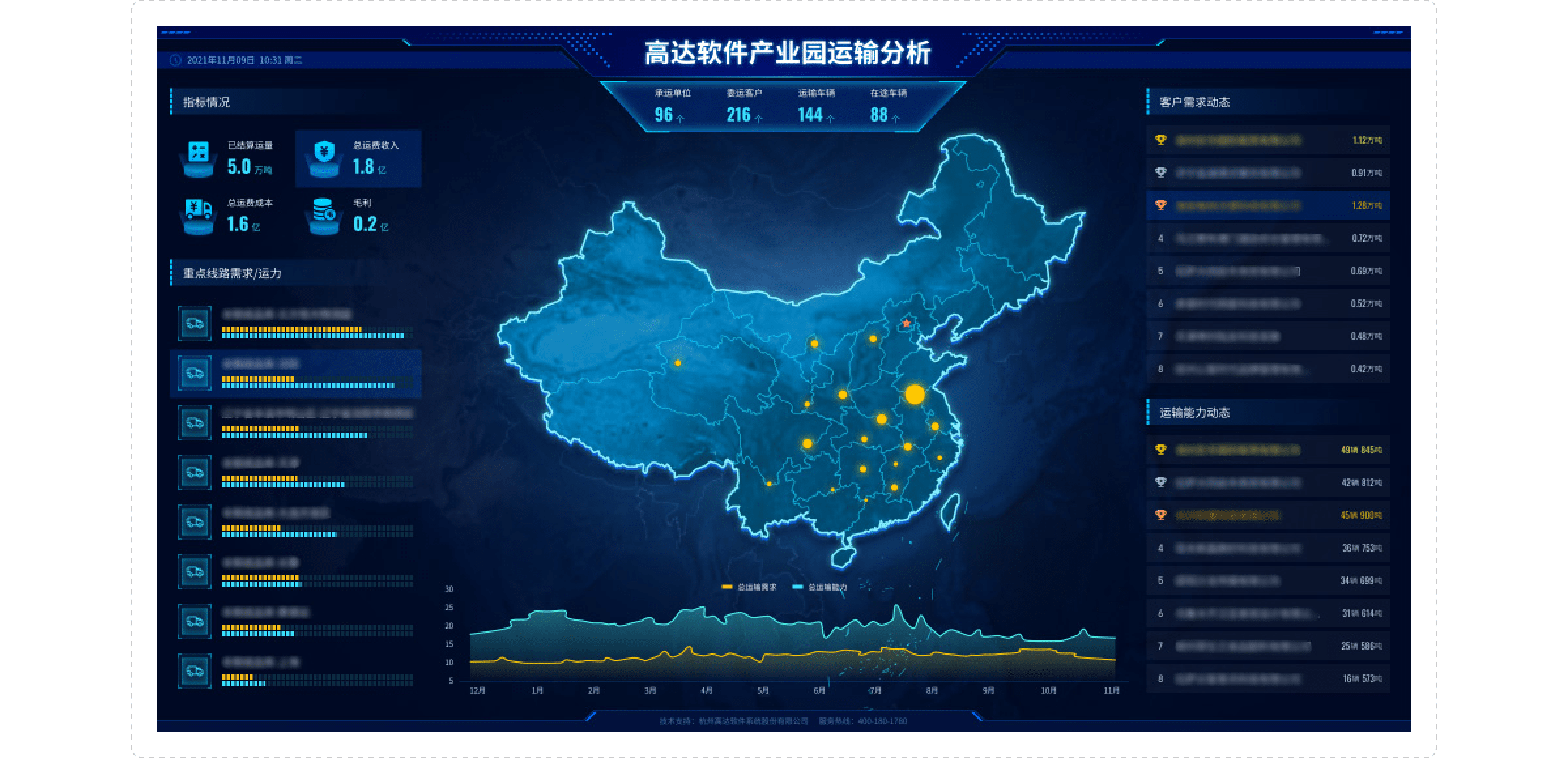 產(chǎn)業(yè)園區(qū)物流分析基于產(chǎn)業(yè)維度對園區(qū)物流運輸相關(guān)業(yè)務(wù)情況進(jìn)行統(tǒng)計分析,包括對園區(qū)內(nèi)的承運單位、委運客戶、運力資源運營數(shù)據(jù)進(jìn)行匯集,統(tǒng)計結(jié)算運量、運費收入/成本及毛利數(shù)據(jù),展示重點線路對應(yīng)需求及運力情況;為產(chǎn)業(yè)園區(qū)從運營視角提供精準(zhǔn)業(yè)務(wù)數(shù)據(jù)依據(jù),實現(xiàn)園區(qū)有針對性的優(yōu)化運營策略、提升園區(qū)在行業(yè)中的綜合競爭力。
