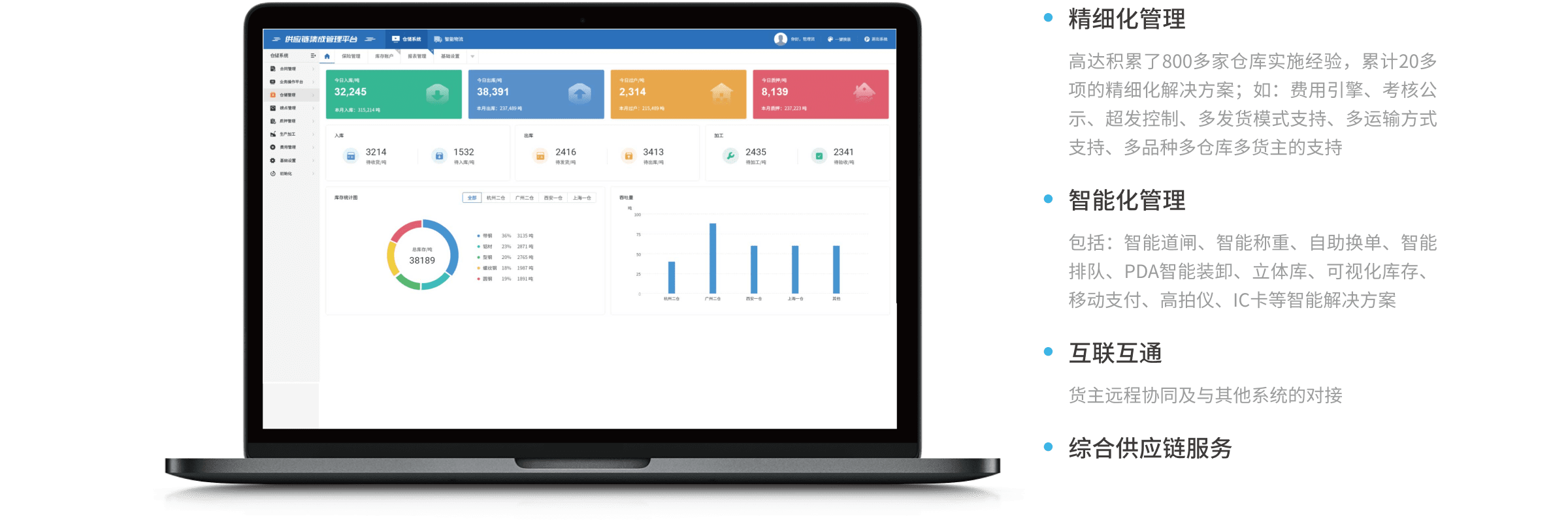 高達智慧云倉管理系統(tǒng),幫助倉庫作業(yè)實現數字化、智能化管理。內部集成各類智能化設備(如:智能道閘、智能地磅、PDA、自助換單機、數字化托盤、高拍儀等)實現高效管理,外部為貨主、物流公司、銀行等各類企業(yè)提供PC端、移動端的自助協(xié)同服務。