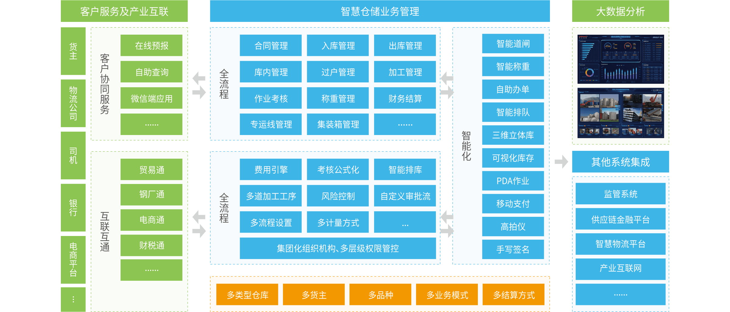 業(yè)務功能 支持多倉庫、多貨主、多品種、多業(yè)務模式、多結算方式的數字化倉儲管理