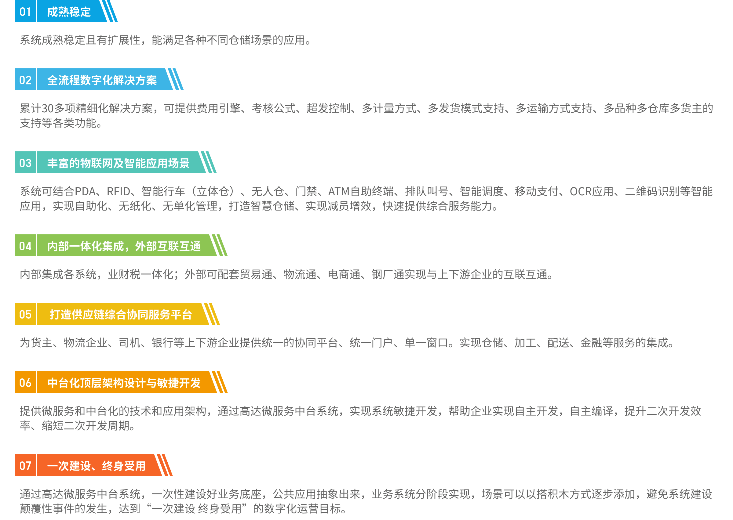 高達智慧云倉管理系統(tǒng)基于行業(yè)領先的“6+1+N”微服務架構設計,引入客商中心和合同中心等公共業(yè)務中臺,與鋼材倉庫、有色倉庫、散貨倉庫、平堆托盤倉庫、貨架倉庫、自動裝卸立體庫等業(yè)務模式相融合,并與智能報表、Iot物聯技術、智能語音、智慧視頻、大數據技術、RPA和AI等人工智能技術集成,實現分布式多倉庫、多品類、多貨主、多業(yè)務模式和多結算方式的數字化倉儲管理平臺;實現全流程、全線上無紙化、智能化、自助化、無人化和可視化管理,快速提升倉庫作業(yè)效率、客戶服務能力,支撐產業(yè)鏈延伸及社會資源整合。是高達軟件深耕鋼鐵行業(yè)28年和全國800多家倉庫成功應用積累的寶貴管理經驗的結晶。