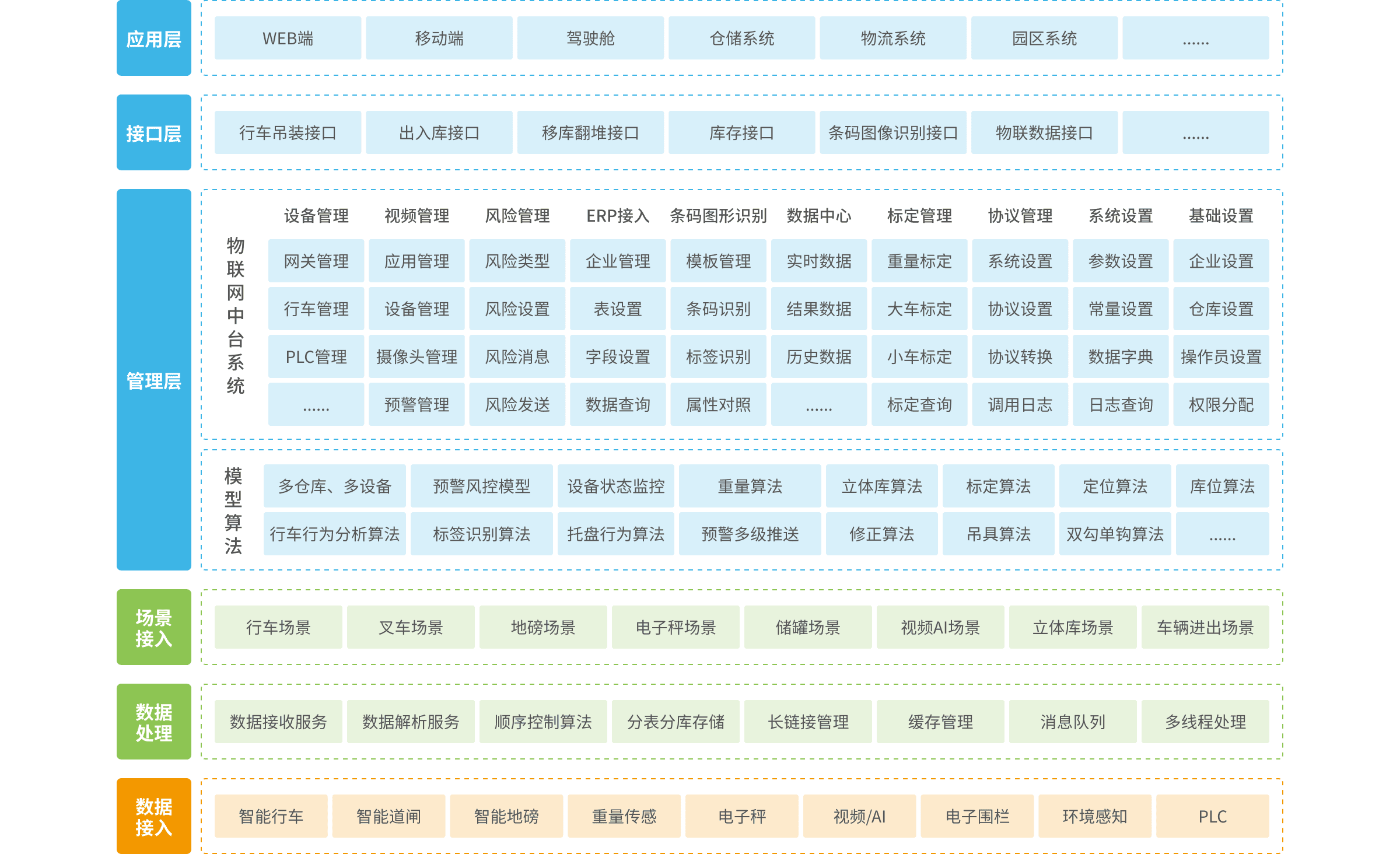 高達(dá)物聯(lián)網(wǎng)組件中臺(tái),支持視頻、AI、道閘、地磅、電子秤、智能行車(chē)、智能叉車(chē)和環(huán)境傳感等多種物聯(lián)網(wǎng)設(shè)備的信號(hào)接入、處理、存儲(chǔ)以及設(shè)備的日常管理、跟蹤、數(shù)據(jù)分析以及對(duì)外提供標(biāo)準(zhǔn)接口,供倉(cāng)儲(chǔ)系統(tǒng)、物流系統(tǒng)、園區(qū)系統(tǒng)等業(yè)務(wù)系統(tǒng)的調(diào)用、集成,幫助業(yè)務(wù)系統(tǒng)快速實(shí)現(xiàn)物聯(lián)網(wǎng)技術(shù)的應(yīng)用、快速提高效率和風(fēng)險(xiǎn)管理能力。