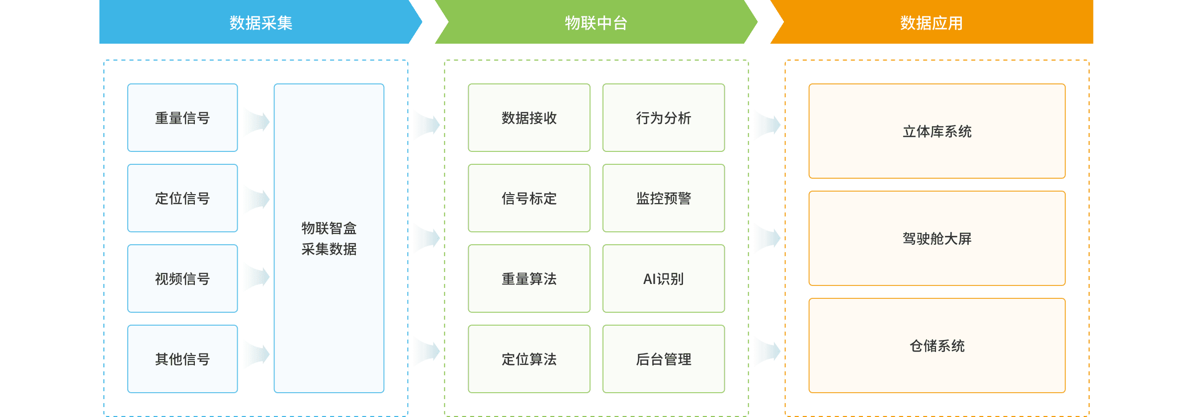 物聯(lián)網(wǎng)組件中臺(tái)將物聯(lián)智盒采集現(xiàn)場(chǎng)的重量、定位等信號(hào)信息進(jìn)行處理、解析、并轉(zhuǎn)換為有效具體的裝卸數(shù)據(jù)信息,結(jié)合行車(chē)行為分析和立體庫(kù)算法,將物聯(lián)網(wǎng)的數(shù)據(jù)轉(zhuǎn)換為立體庫(kù)里的鋼卷信息,并在駕駛艙大屏,業(yè)務(wù)系統(tǒng)中實(shí)時(shí)顯示。