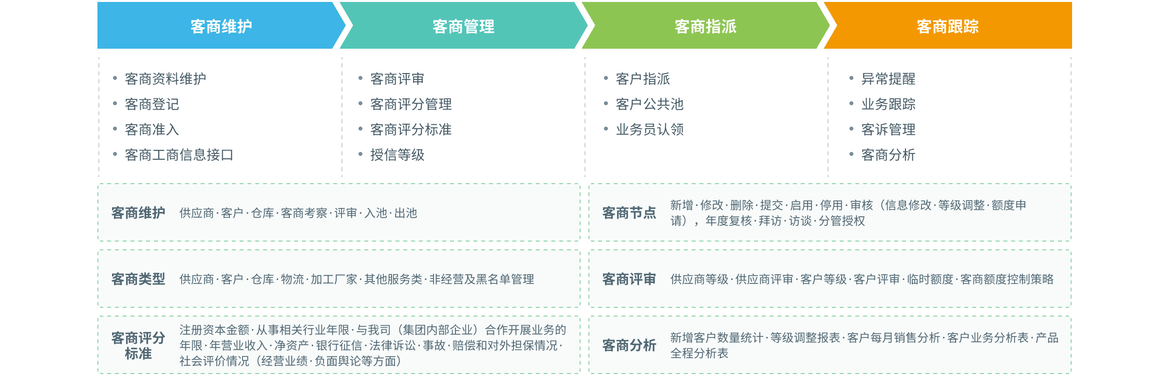 以客商需求為導(dǎo)向,以客商服務(wù)為中心,通過對客商進行分組、指派,規(guī)范管理客商信息,并研究和分析不同的消費需求和服務(wù)需求, 收集和分析客商信息。制定合理的客商授信體系,定期對客商進行評級和風(fēng)險分析,實時監(jiān)控客商的業(yè)務(wù)風(fēng)險。把握客商需求特征和行為偏好,積累和共享客商知識,有針對性地為客商提供產(chǎn)品或服務(wù),提高客商的忠誠度和滿意度。