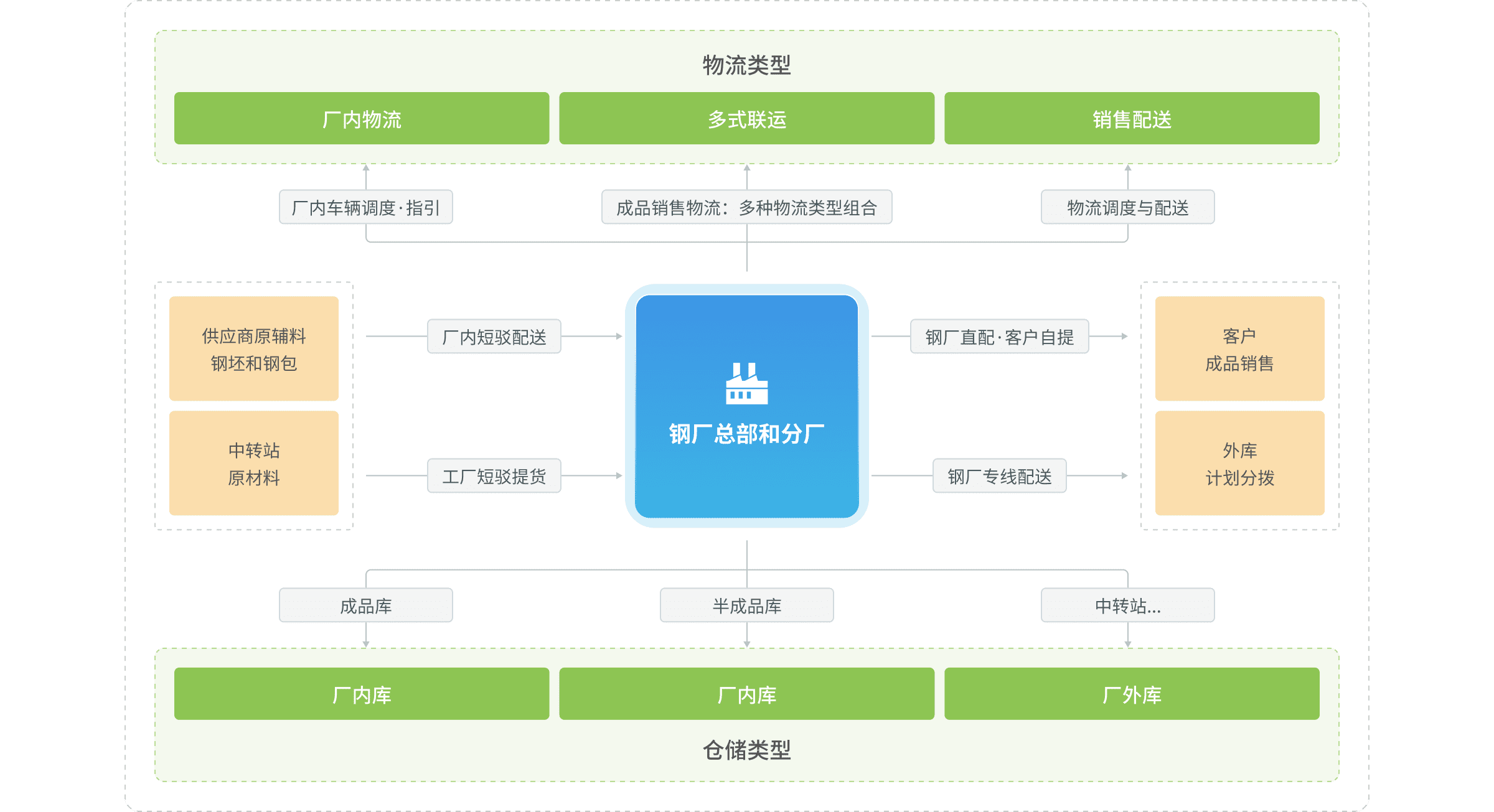 鋼廠產(chǎn)成品物流包括廠內(nèi)半成品、產(chǎn)成品的倉儲和廠內(nèi)短駁運輸、廠內(nèi)物流調(diào)度、廠外倉儲、加工和運輸配送等管理和服務(wù)全過程,業(yè)務(wù)全場景如下圖: