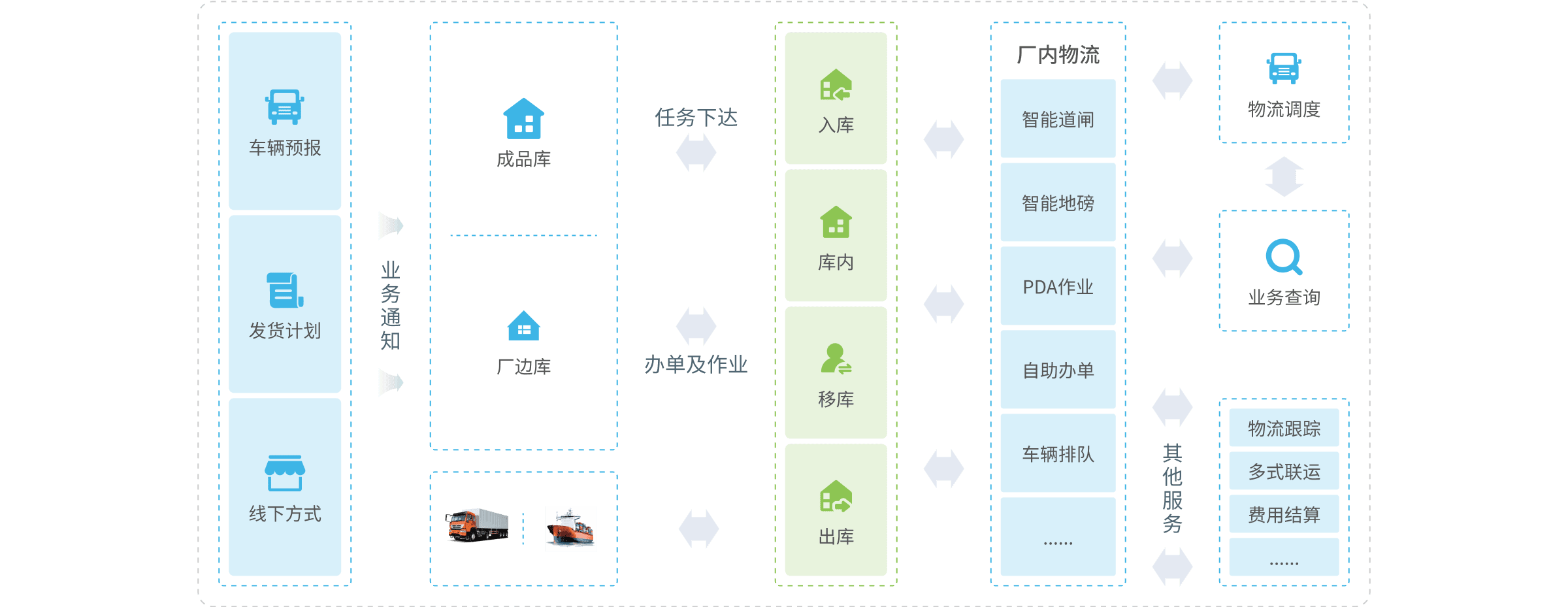 廠內(nèi)物流:廠內(nèi)各生產(chǎn)單元間送貨、提貨和短駁等,傳統(tǒng)車輛預報、排隊、指引、過磅和放行等環(huán)節(jié)信息脫節(jié),造成廠內(nèi)經(jīng)常車輛擁堵。