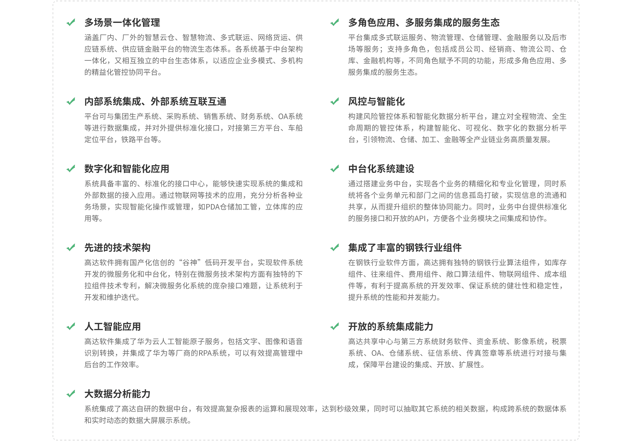 北方恒達物流園是本鋼集團公司為提高服務(wù)東北市場能力,增大客戶粘性,體現(xiàn)以客戶為中心的戰(zhàn)略性項目;園區(qū)依托專業(yè)加工、倉儲配送和相關(guān)產(chǎn)業(yè)服務(wù)三大功能,以電商銷售平臺為核心,依靠電商平臺作為主要銷售手段和渠道,高達軟件助力恒達物流實現(xiàn)線上線下全方位的服務(wù)支持,包括在線交易服務(wù)、園區(qū)智能管理服務(wù)、智慧倉儲服務(wù)、智慧物流服務(wù)、智慧運營服務(wù)、金融服務(wù)、加工服務(wù)、大數(shù)據(jù)分析服務(wù),結(jié)合在線預約、無人倉系統(tǒng)、立體倉系統(tǒng)、PDA作業(yè)、門禁系統(tǒng)、排隊叫號系統(tǒng)、在線結(jié)算服務(wù)、消息服務(wù)等功能為客戶、司機、現(xiàn)場業(yè)務(wù)員提供完善的自助服務(wù),讓鋼鐵供應鏈各鏈條緊密結(jié)合,實現(xiàn)國內(nèi)首個無單作業(yè)物流園。