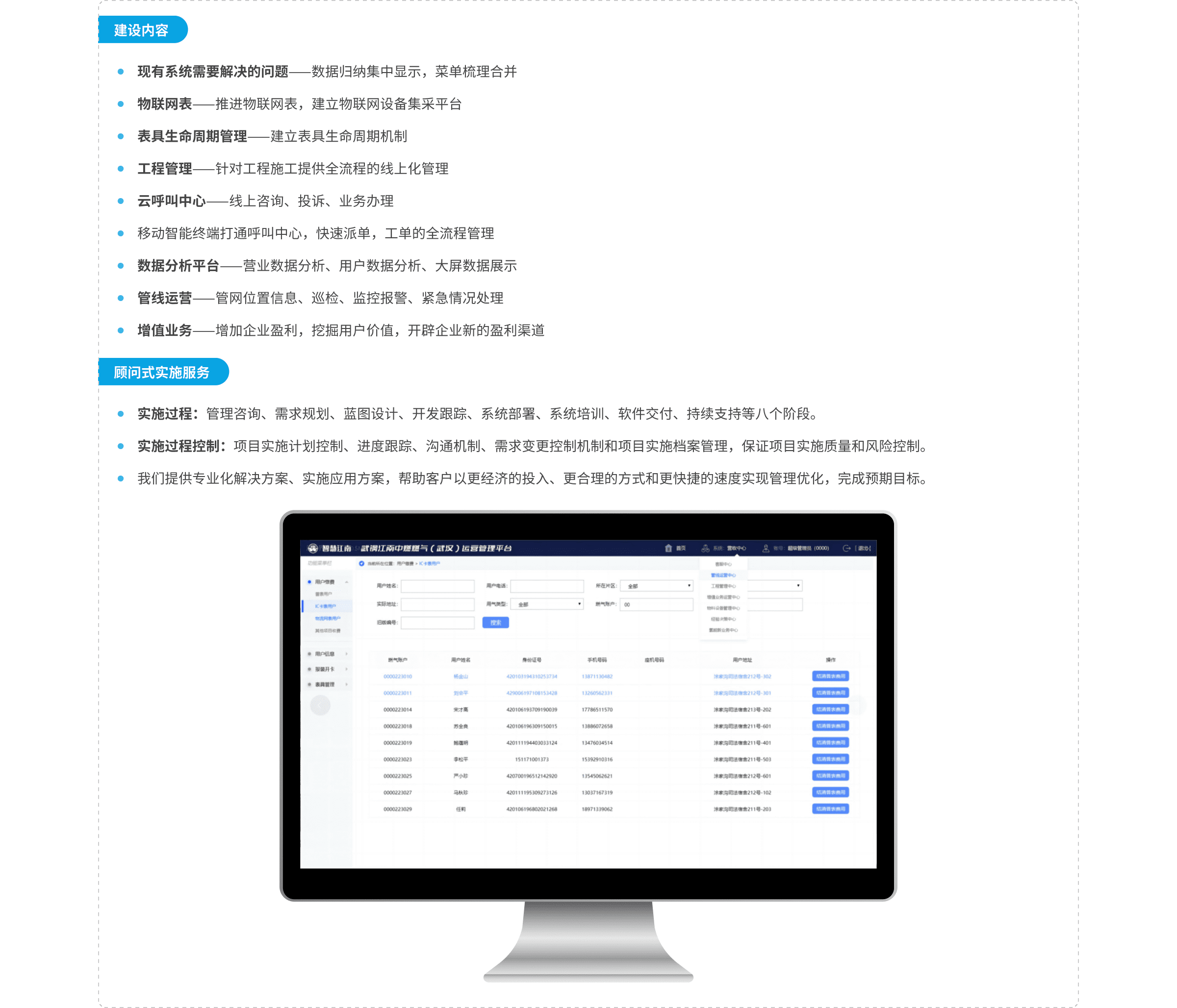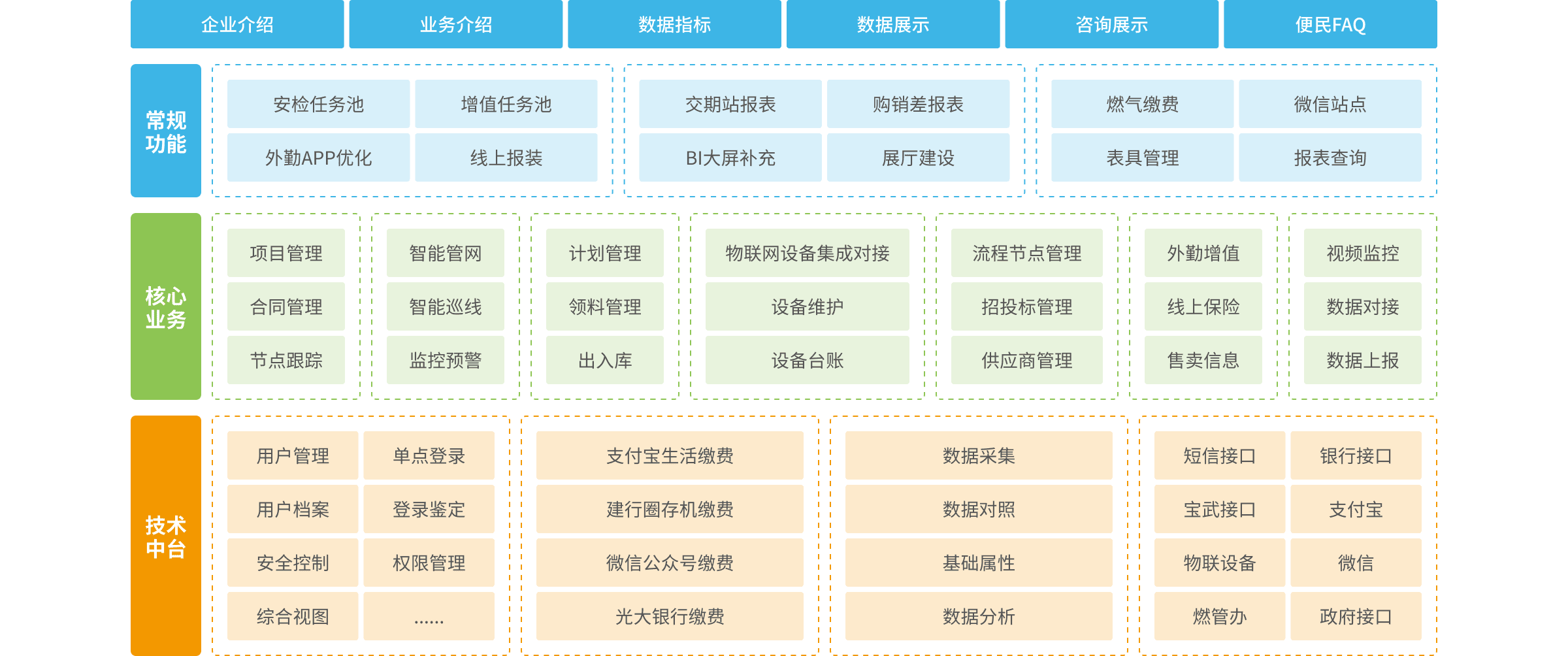 高達(dá)智慧燃?xì)夥?wù)平臺(tái)基于先進(jìn)微服務(wù)架構(gòu)設(shè)計(jì),功能層面囊括了營(yíng)業(yè)廳收費(fèi)、用戶報(bào)裝、普表抄收、IC表繳費(fèi)圈存、用戶安檢、用戶維修、燃?xì)饣椤⒂脩舳嗲览U費(fèi)、工程管理、客服中心、增值服務(wù)管理、資產(chǎn)設(shè)備管理、管線運(yùn)營(yíng)等相關(guān)業(yè)務(wù)。