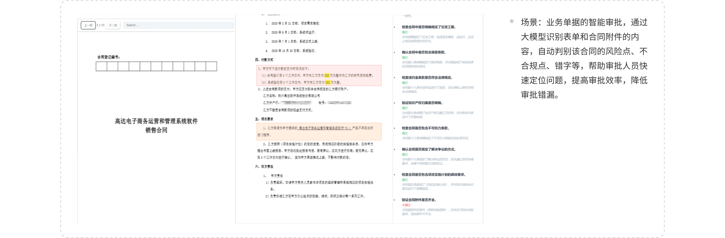 應(yīng)用場(chǎng)景4:智能輔助審批 采用平臺(tái)定義的審批標(biāo)準(zhǔn),對(duì)模型進(jìn)行訓(xùn)練,達(dá)到能自動(dòng)核驗(yàn)單據(jù)附件的相關(guān)內(nèi)容。