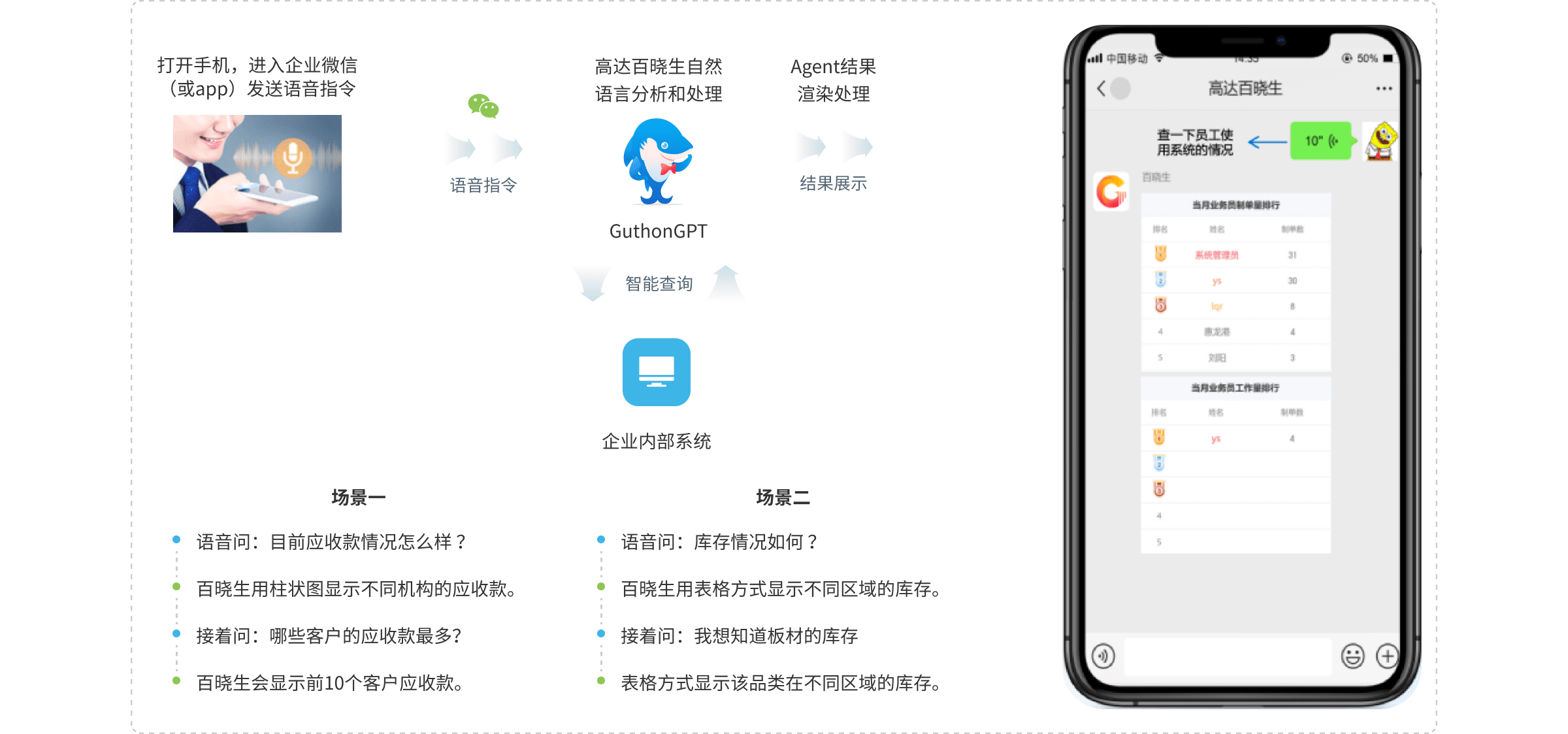 應(yīng)用場(chǎng)景1:業(yè)務(wù)信息智能查詢 通過日常交流語言即可實(shí)現(xiàn)企業(yè)內(nèi)部數(shù)據(jù)的查詢、分析和可視化展示。