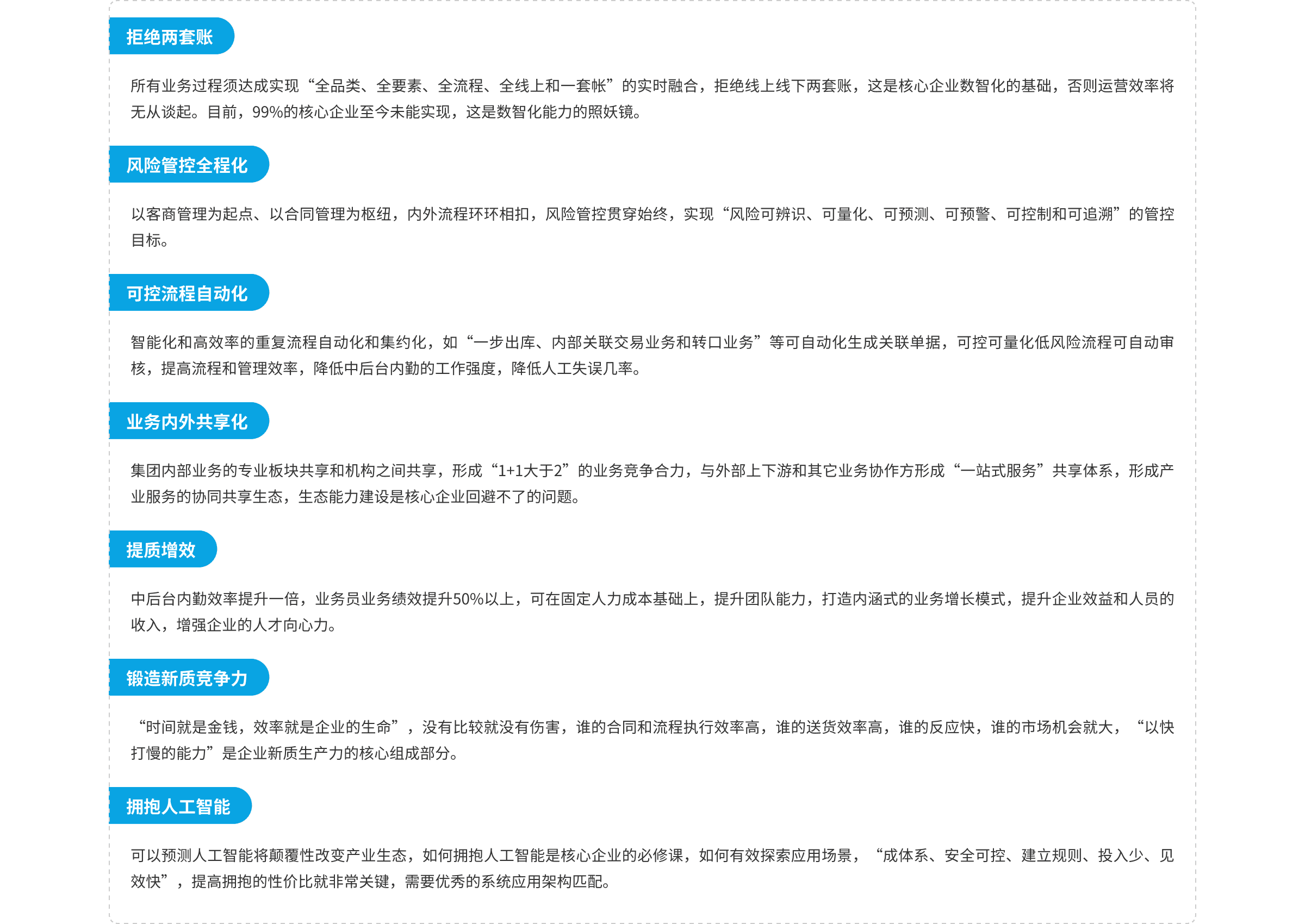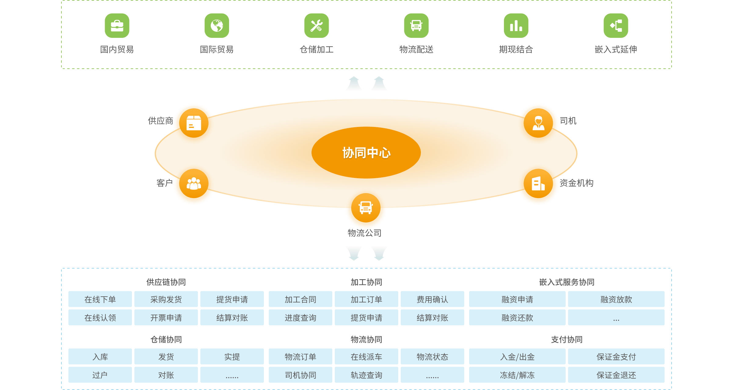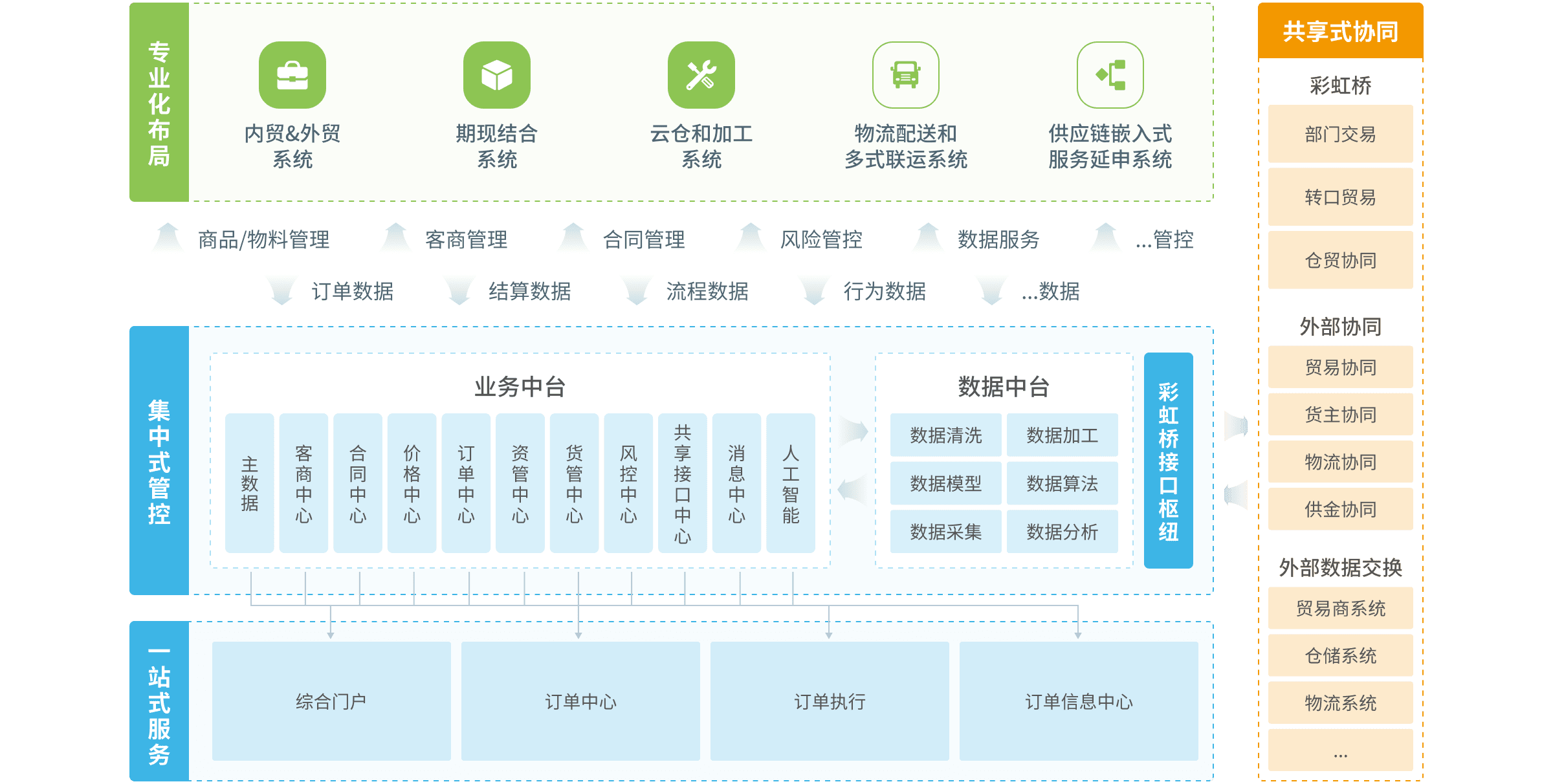 核心企業(yè)業(yè)務(wù)模式呈現(xiàn)專業(yè)化和全國性布局特征,運(yùn)營風(fēng)險需要實(shí)時有效地集中式管控,并得到集團(tuán)管理中心的能力支撐,業(yè)務(wù)模式能夠快速有效復(fù)制和裂變,各業(yè)務(wù)板塊能夠進(jìn)行有效和共享協(xié)同,通過單一窗口對產(chǎn)業(yè)客戶進(jìn)行一站式協(xié)同和一單制服務(wù)。
