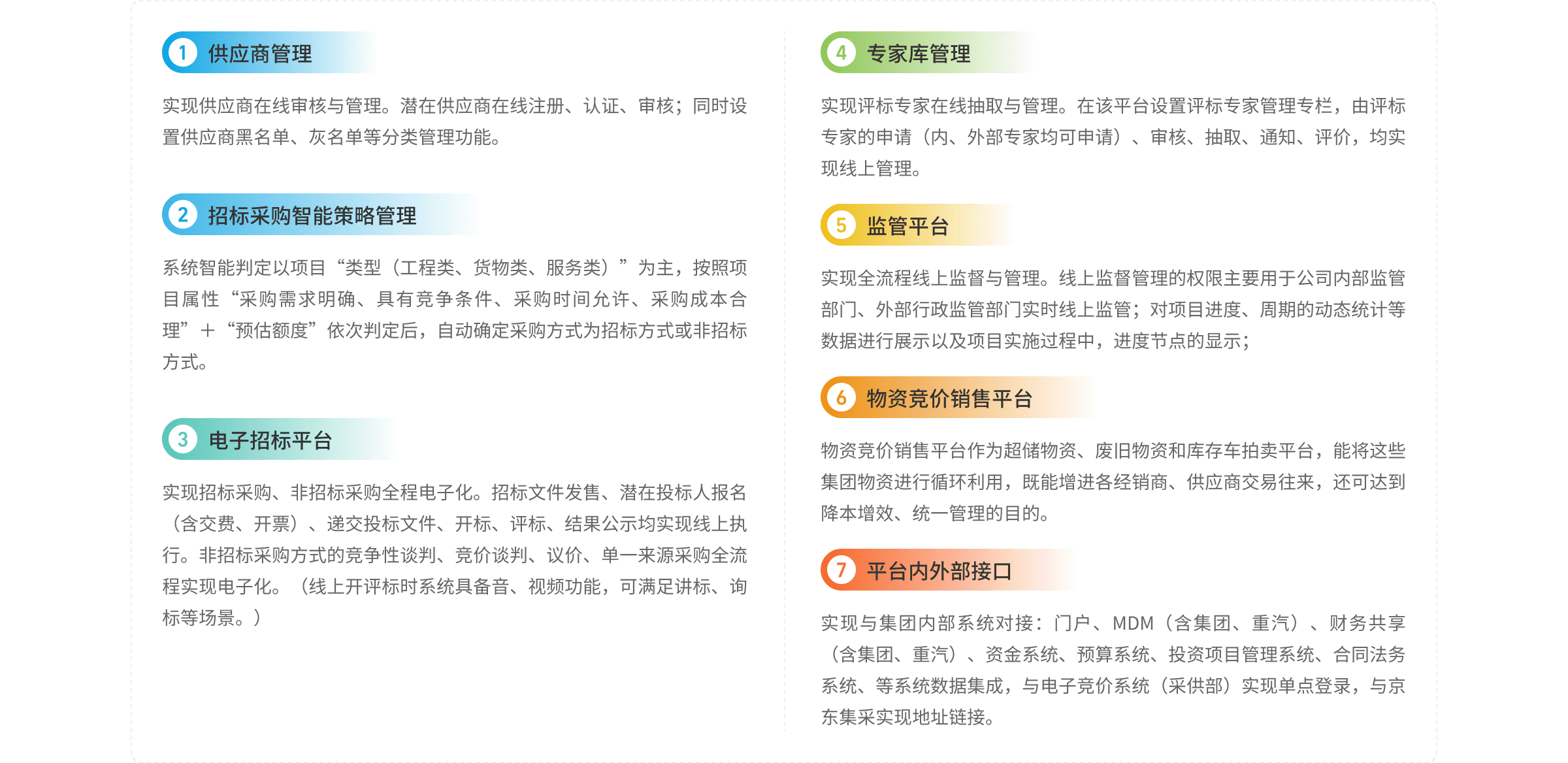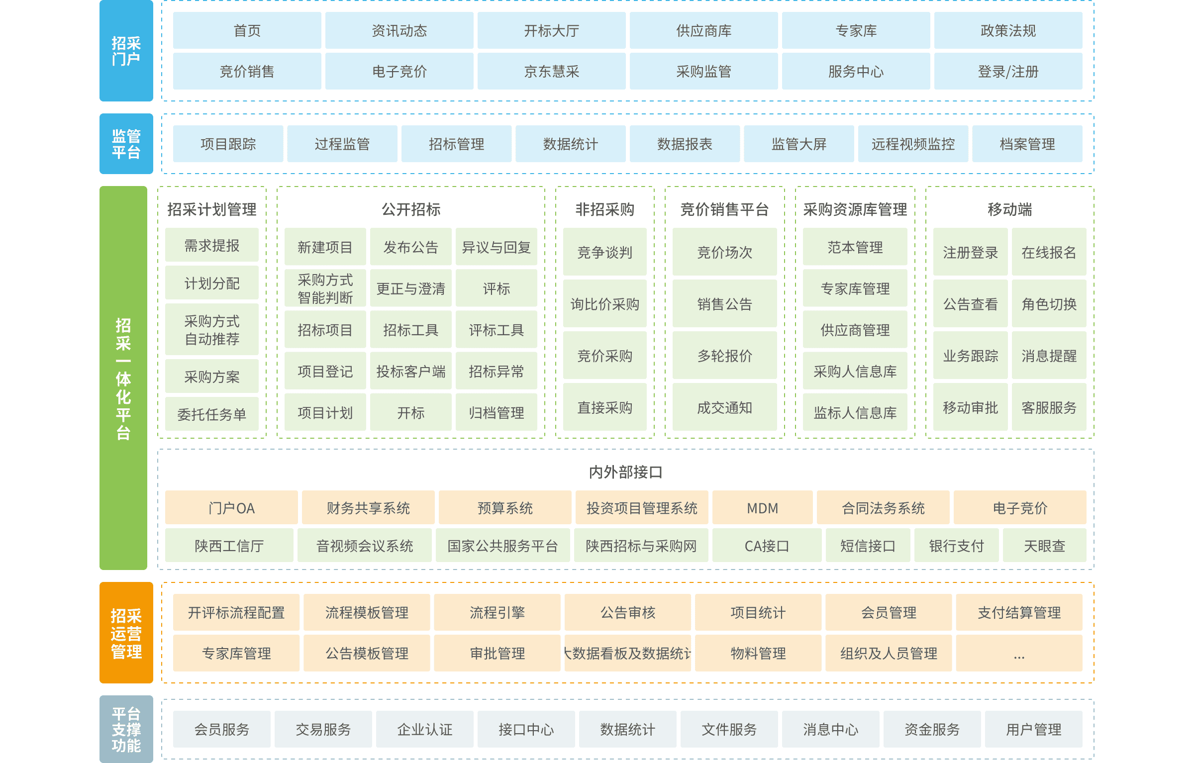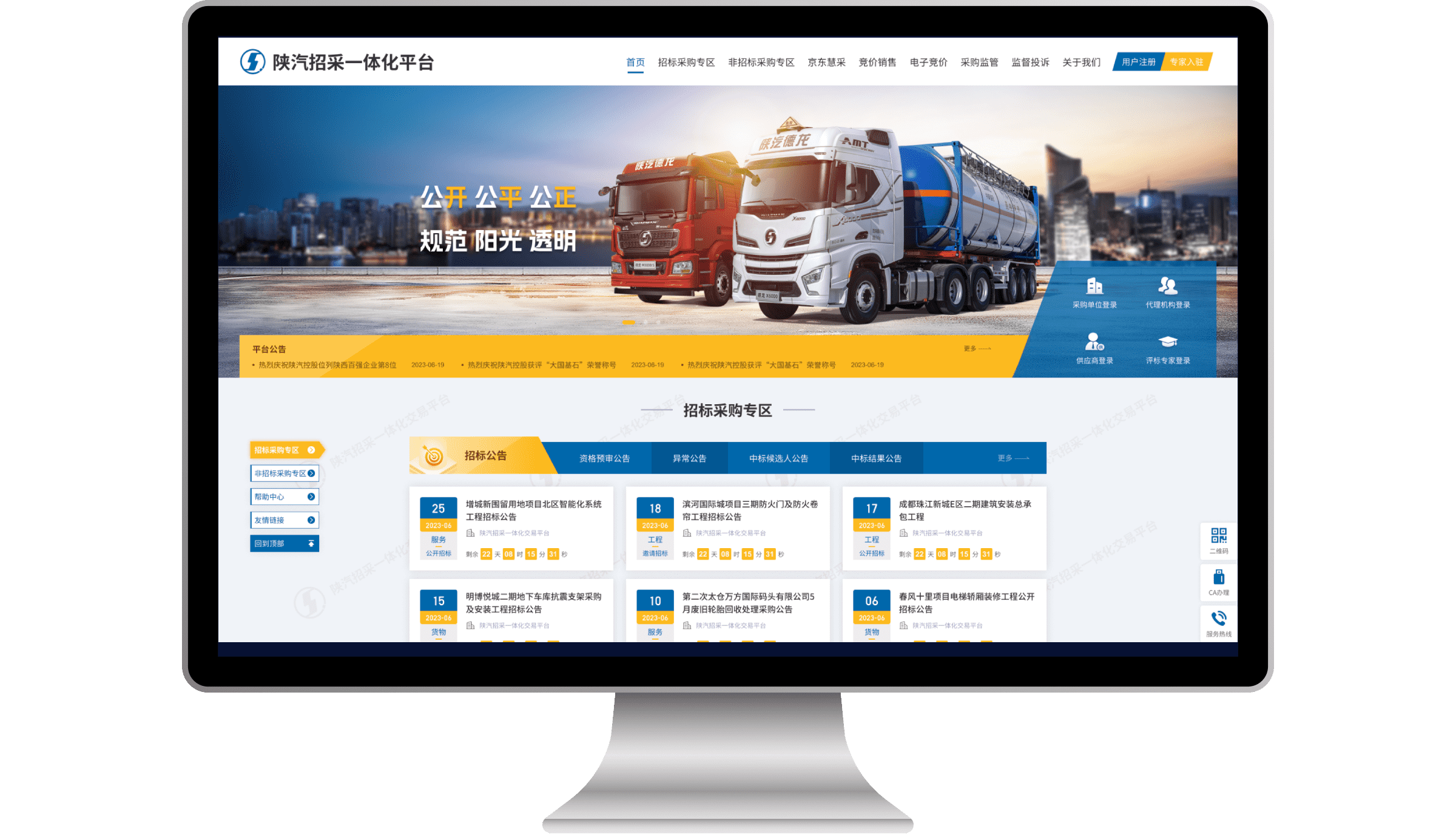 陜汽構建統(tǒng)一的電子招投標平臺,實現非招標采購與招標采購的一體化管理,從而對集團及各子公司的招標采購業(yè)務形成高效有力的管控。平臺致力于打造具備智能招標人案制定、全流程電子招投標、非標業(yè)務管理、招標監(jiān)管、專家?guī)旃芾?、供應商庫管理、競價銷售等功能的全過程信息化管理體系,以此顯著提高招標采購業(yè)務的內部協(xié)同效率,助力管理水平實現質的提升。同時,平臺與陜汽現有的信息化平臺深度對接,實現數據互通與業(yè)務協(xié)同,涵蓋財務共享系統(tǒng)、門戶系統(tǒng)、預算系統(tǒng)、主數據系統(tǒng)、法務系統(tǒng)等,構建起一體化的數字化管理生態(tài)。