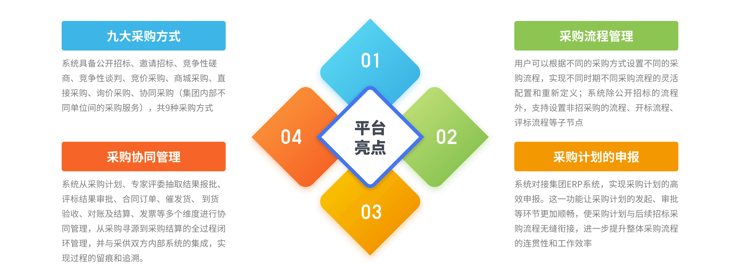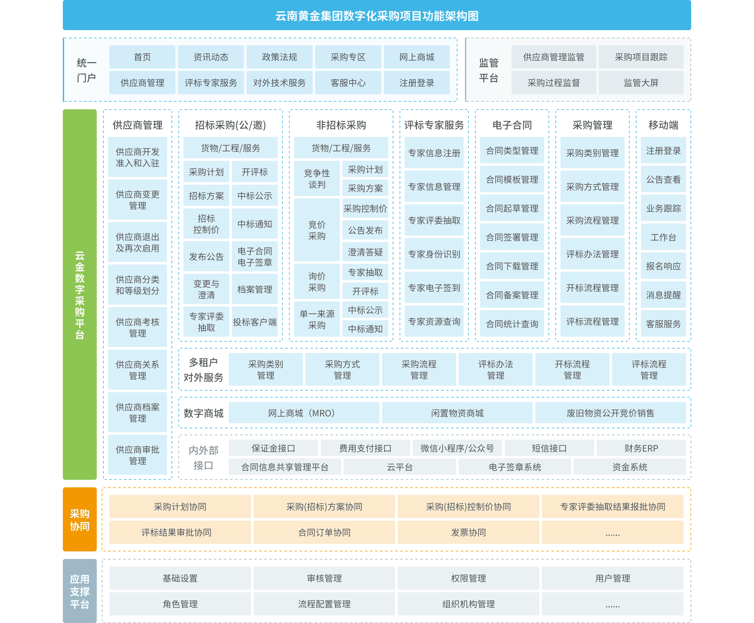 通過建設(shè)集團(tuán)數(shù)字化采購(gòu)平臺(tái),打造一個(gè)集供應(yīng)商管理、招標(biāo)采購(gòu)、非招標(biāo)采購(gòu)、網(wǎng)上商城、廢舊物資處置、電子合同(電子簽章)、供應(yīng)商協(xié)同、采購(gòu)協(xié)同、審計(jì)監(jiān)督、移動(dòng)端運(yùn)用為一體的綜合采購(gòu)管理平臺(tái)。