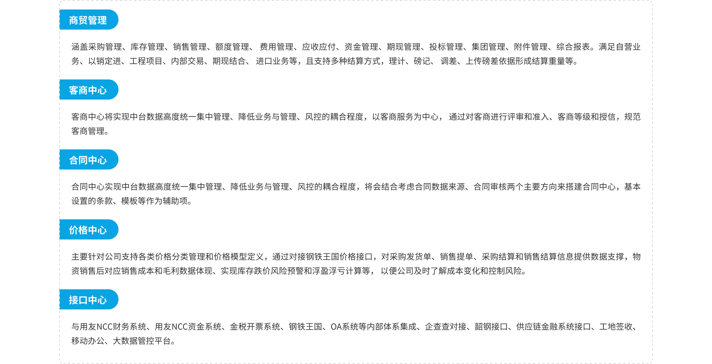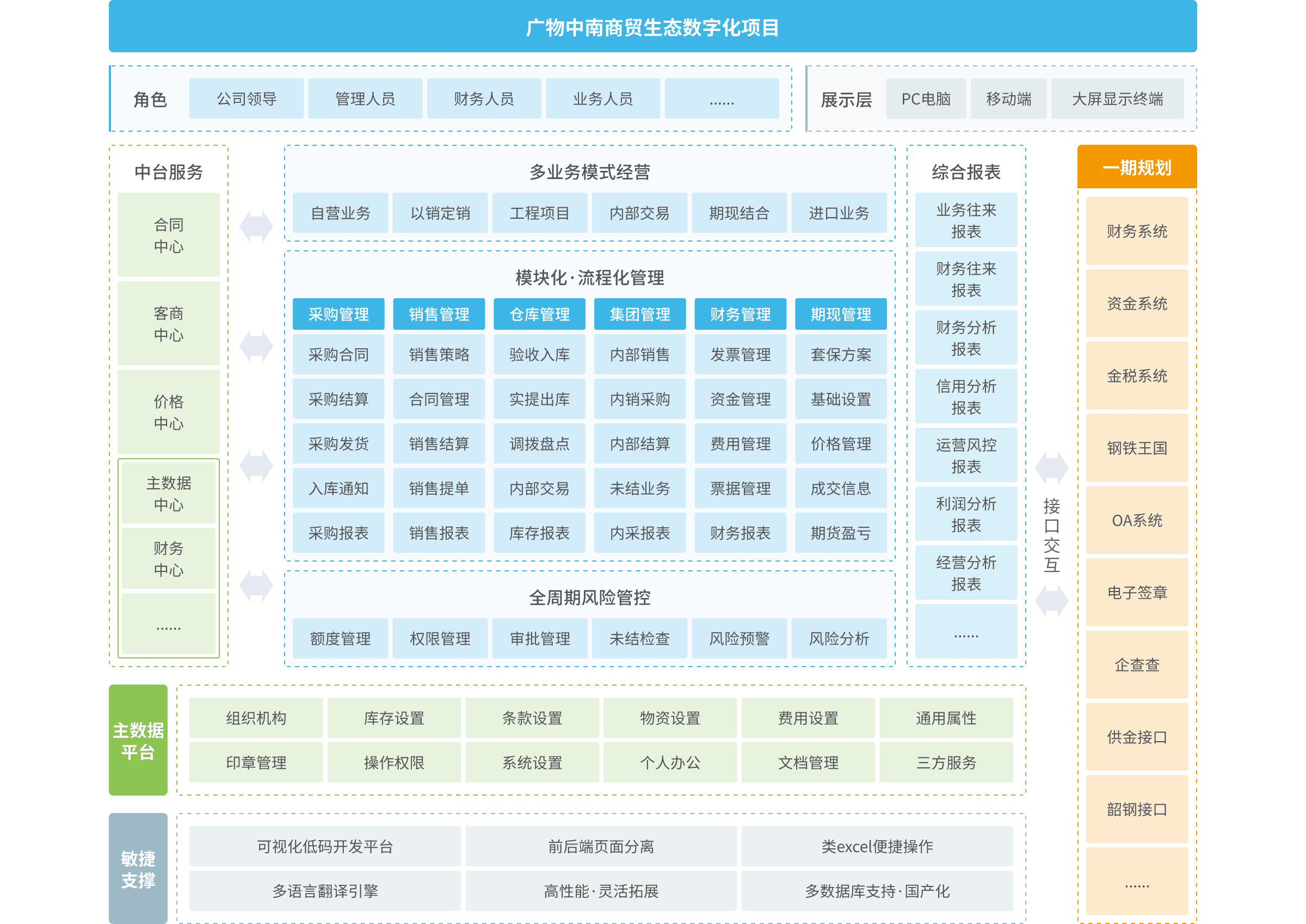 廣物中南項目主要圍繞主數(shù)據(jù)、商貿(mào)管理、客商中心、合同中心、價格中心、接口中心進行本期信息化建設,同時與用友NCC財務系統(tǒng)、用友NCC資金系統(tǒng)、金稅開票系統(tǒng)、鋼鐵王國(電商、云倉、物流、采購平臺和報價接口)、OA系統(tǒng)等內(nèi)部體系集成、企查查對接、韶鋼接口、供應鏈金融系統(tǒng)接口、工地簽收、移動辦公、大數(shù)據(jù)管控平臺實現(xiàn)供應鏈環(huán)節(jié)商貿(mào)業(yè)務的精細化管理、集團化管控,滿足財務風險管控訴求。
