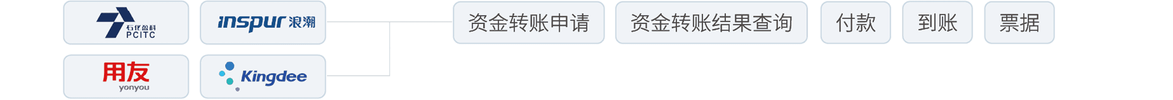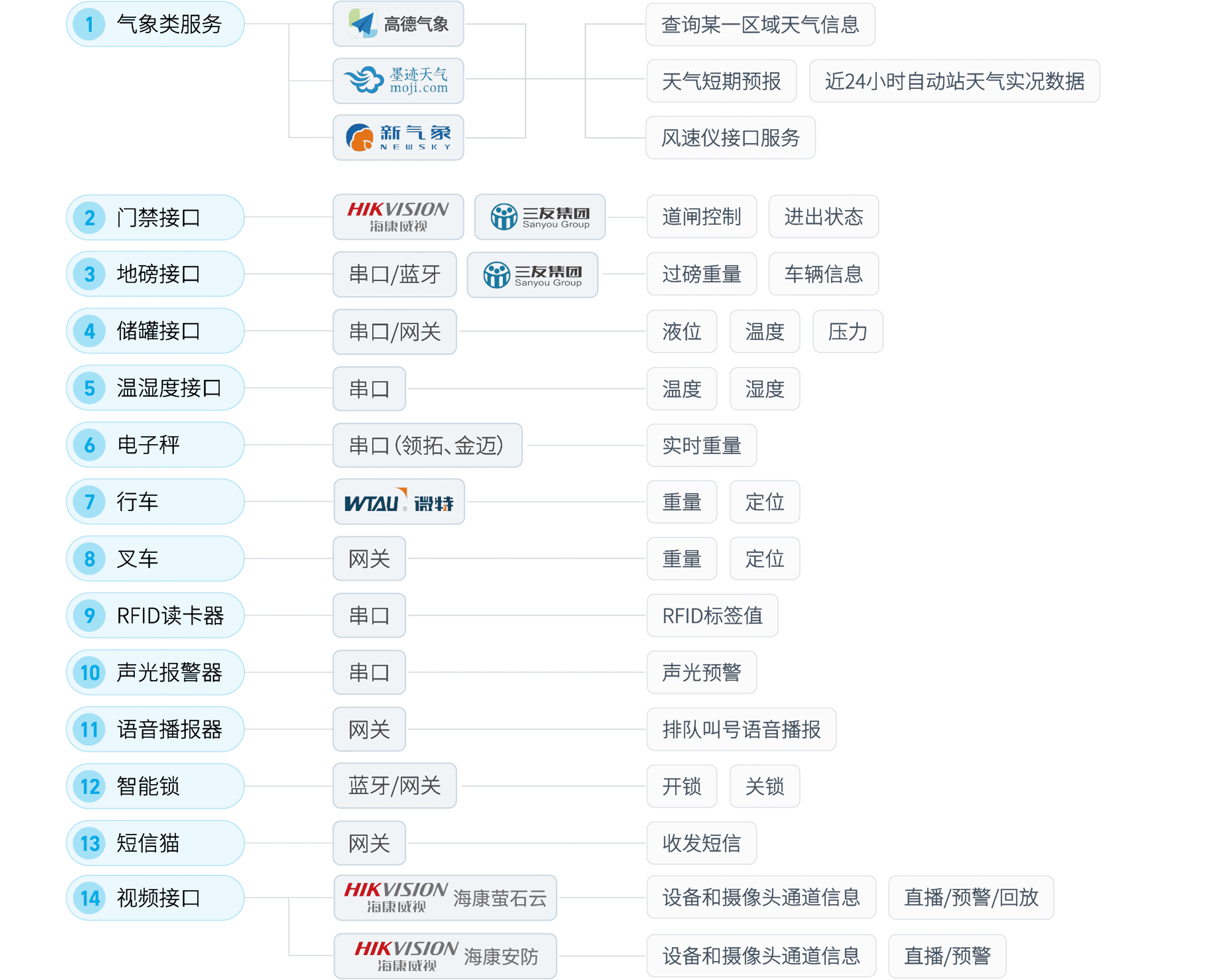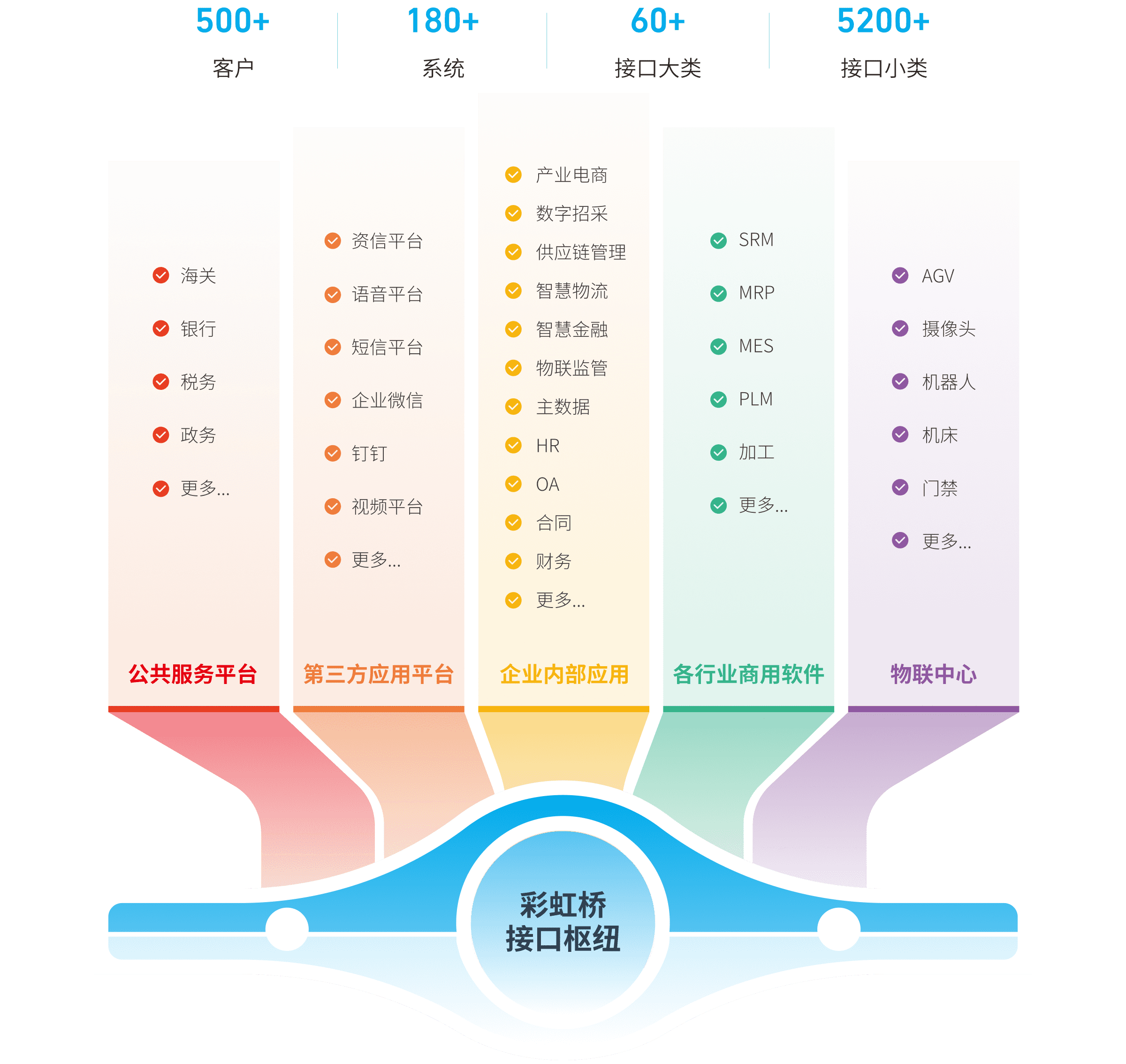 彩虹橋內(nèi)置了豐富的接口服務(wù),包括公共服務(wù)平臺(tái)(政府、銀行等)、第三方商業(yè)應(yīng)用平臺(tái)、各行各業(yè)商用軟件、企業(yè)內(nèi)部應(yīng)用和物聯(lián)網(wǎng)中心等五大接口服務(wù),通過(guò)導(dǎo)入這些內(nèi)置接口服務(wù),企業(yè)可以快速實(shí)現(xiàn)內(nèi)、外部系統(tǒng)互聯(lián)互通和數(shù)據(jù)融合。