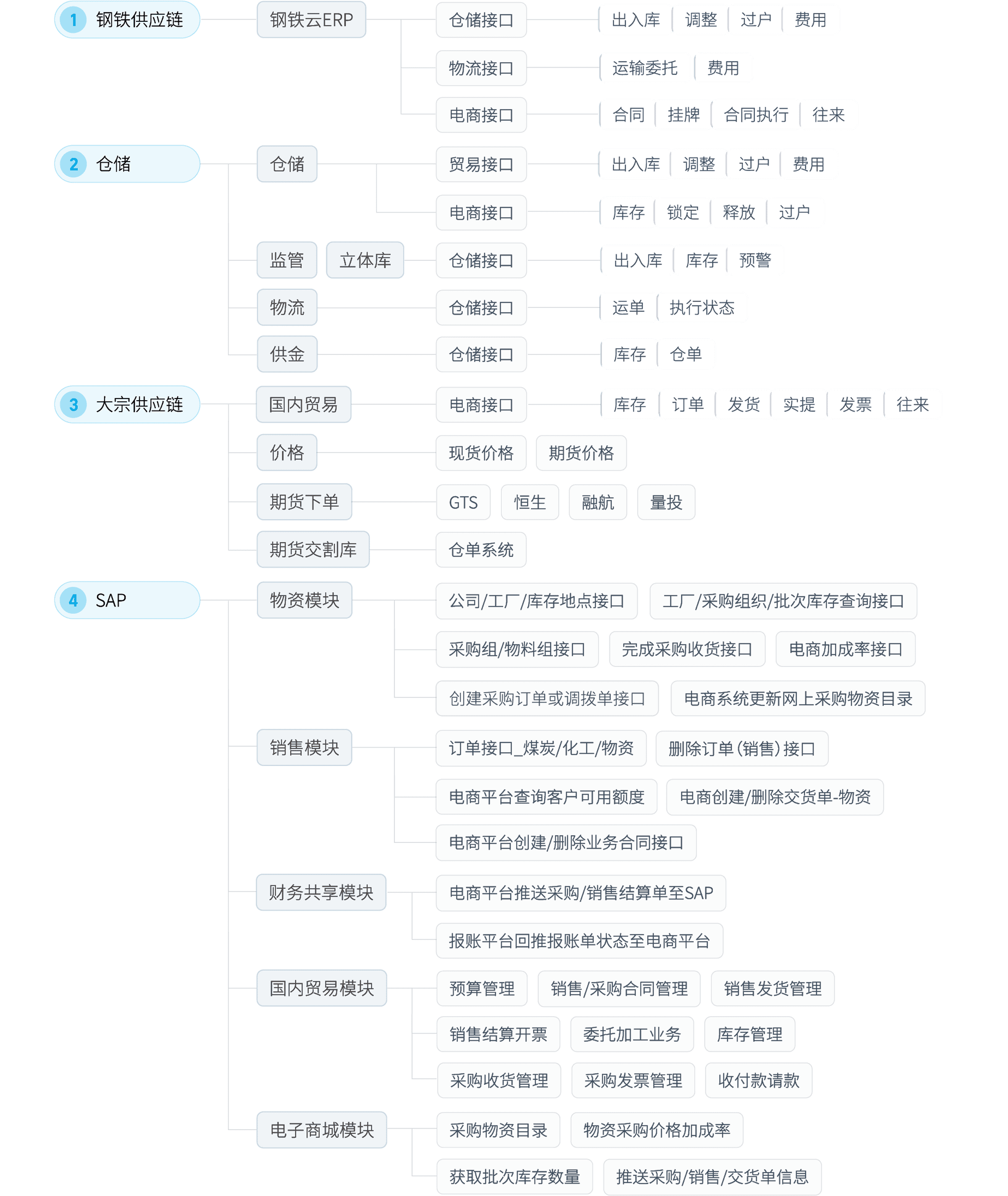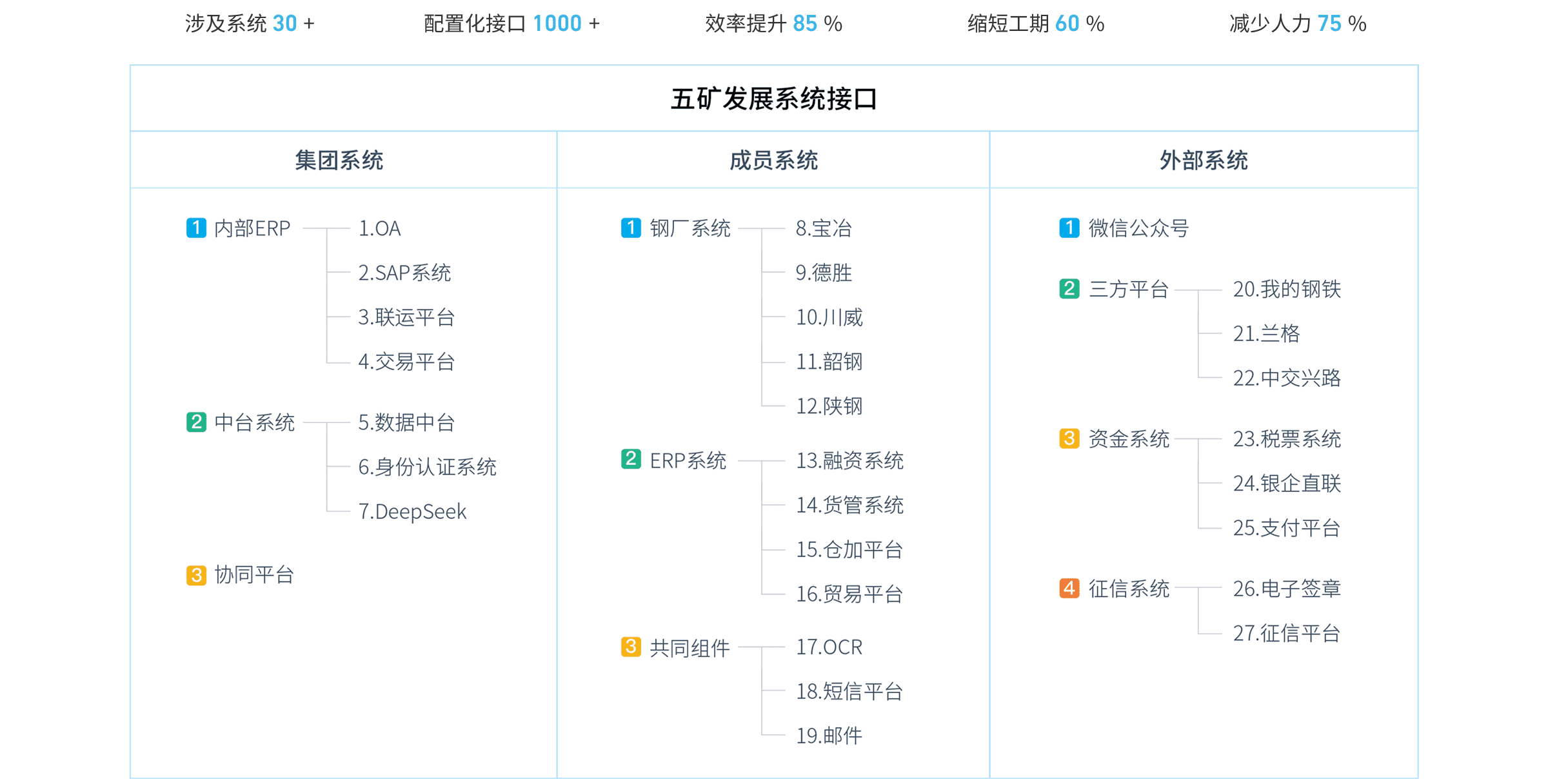 五礦發(fā)展采用“彩虹橋”共享平臺(tái),構(gòu)建企業(yè)級(jí)系統(tǒng)集成中樞,實(shí)現(xiàn)業(yè)務(wù)與數(shù)據(jù)的深度融合。該平臺(tái)通過(guò)統(tǒng)一接入標(biāo)準(zhǔn)和規(guī)范化接口管理,將傳統(tǒng)的“N*N”復(fù)雜網(wǎng)狀對(duì)接模式革新為高效的“N*1”模式,顯著減少了接口數(shù)量和開(kāi)發(fā)復(fù)雜性。平臺(tái)無(wú)縫整合了電商平臺(tái)(對(duì)接18個(gè)系統(tǒng))、倉(cāng)加平臺(tái)、貿(mào)易平臺(tái)、貨管平臺(tái)(對(duì)接50多個(gè)倉(cāng)庫(kù))等核心系統(tǒng)。