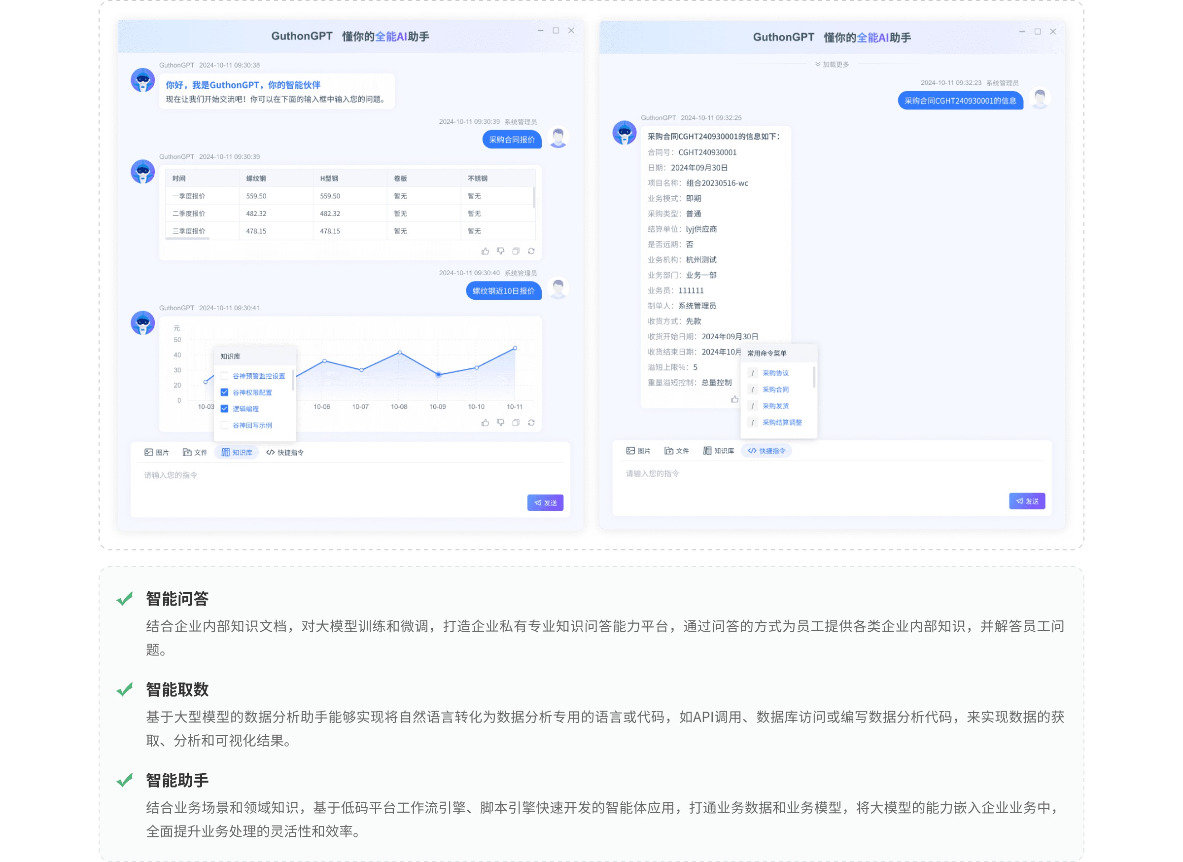 高達百曉生大模型是以通用大模型為基礎,以應用場景需求為牽引,結合行業(yè)知識庫、通用大模型、行業(yè)大模型等,打造可融入業(yè)務系統(tǒng)的場景大模型。該模型依托于ERP聯(lián)動機制的AI意圖引擎,實現(xiàn)對企業(yè)業(yè)務系統(tǒng)的深度協(xié)同,促進業(yè)務與AI技術的有機融合。使用者可在聊天窗口作為統(tǒng)一入口,實現(xiàn)高效的一站式辦公。通過精準的語句意圖解析,高達百曉生大模型可助力內(nèi)部信息系統(tǒng)的有效互動。隨著人工智能應用場景的持續(xù)優(yōu)化與完善,高達百曉生大模型顯著提升人工智能在企業(yè)層面的服務能力,為推動企業(yè)人工智能應用建設與發(fā)展提供了有力支撐。