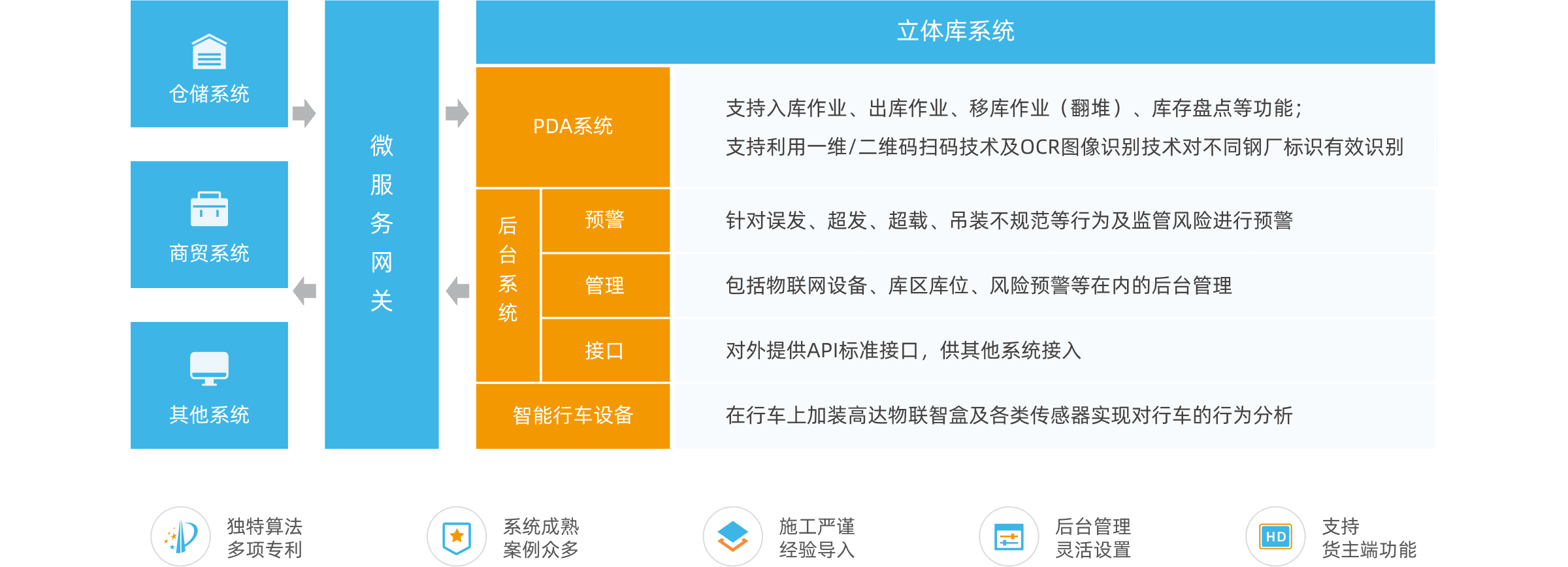 高達(dá)鋼材立體庫和無人倉庫系統(tǒng)基于行業(yè)領(lǐng)先的“6+1+N”微服務(wù)架構(gòu)設(shè)計(jì),集成智能報(bào)表、Iot物聯(lián)技術(shù)、智能語音、智慧視頻、大數(shù)據(jù)技術(shù)、數(shù)字孿生、RPA和AI等人工智能技術(shù),對鋼卷倉庫的原有行車/龍門吊加裝設(shè)備和智能化改造,通過數(shù)學(xué)建模和邊緣計(jì)算實(shí)現(xiàn)鋼卷重量實(shí)時(shí)解析、空間定位、軌跡跟蹤,以及吊、裝、卸和翻堆行為分析,幫助倉庫實(shí)現(xiàn)貨物的三維定位、智能找貨、精準(zhǔn)發(fā)貨、圖形化盤點(diǎn)等智能化管理,快速提升倉庫作業(yè)效率和客戶服務(wù)能力、降低人力成本,是高達(dá)軟件深耕鋼鐵行業(yè)26年和全國800多家倉庫成功應(yīng)用積累的寶貴管理經(jīng)驗(yàn)的結(jié)晶。
