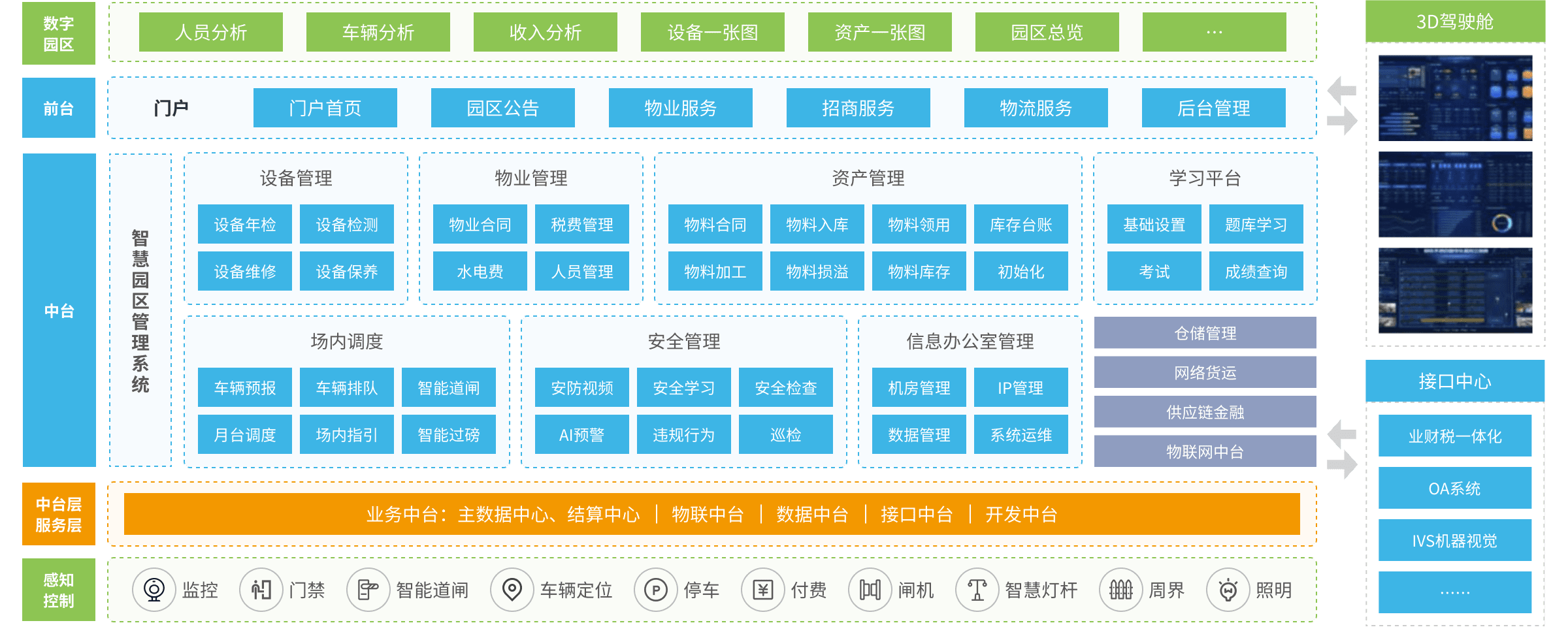 高達(dá)智慧園區(qū)管理系統(tǒng)基于行業(yè)領(lǐng)先的“6+1+N”微服務(wù)架構(gòu)設(shè)計(jì),引入客商中心和合同中心等公共業(yè)務(wù)中臺(tái),集成智能報(bào)表、Iot物聯(lián)技術(shù)、GIS技術(shù)、電子圍欄、智能語音、智慧視頻、大數(shù)據(jù)技術(shù)、數(shù)字孿生、RPA和AI等人工智能技術(shù),實(shí)現(xiàn)園區(qū)的基礎(chǔ)設(shè)施、人員、設(shè)備、其它資產(chǎn)、物業(yè)管理、場(chǎng)內(nèi)調(diào)度、安全管理、學(xué)習(xí)平臺(tái)和信息管理等板塊的數(shù)字化管理,實(shí)現(xiàn)園區(qū)運(yùn)營全流程、全線上無紙化、智能化、自助化、無人化和可視化管理,快速提升園區(qū)運(yùn)營效率和客戶服務(wù)能力。