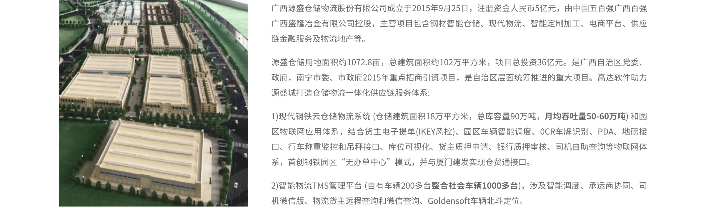 智慧倉儲(chǔ)+智能物流+智慧園區(qū)(1072畝,自有200臺(tái)車及整合1000多臺(tái))