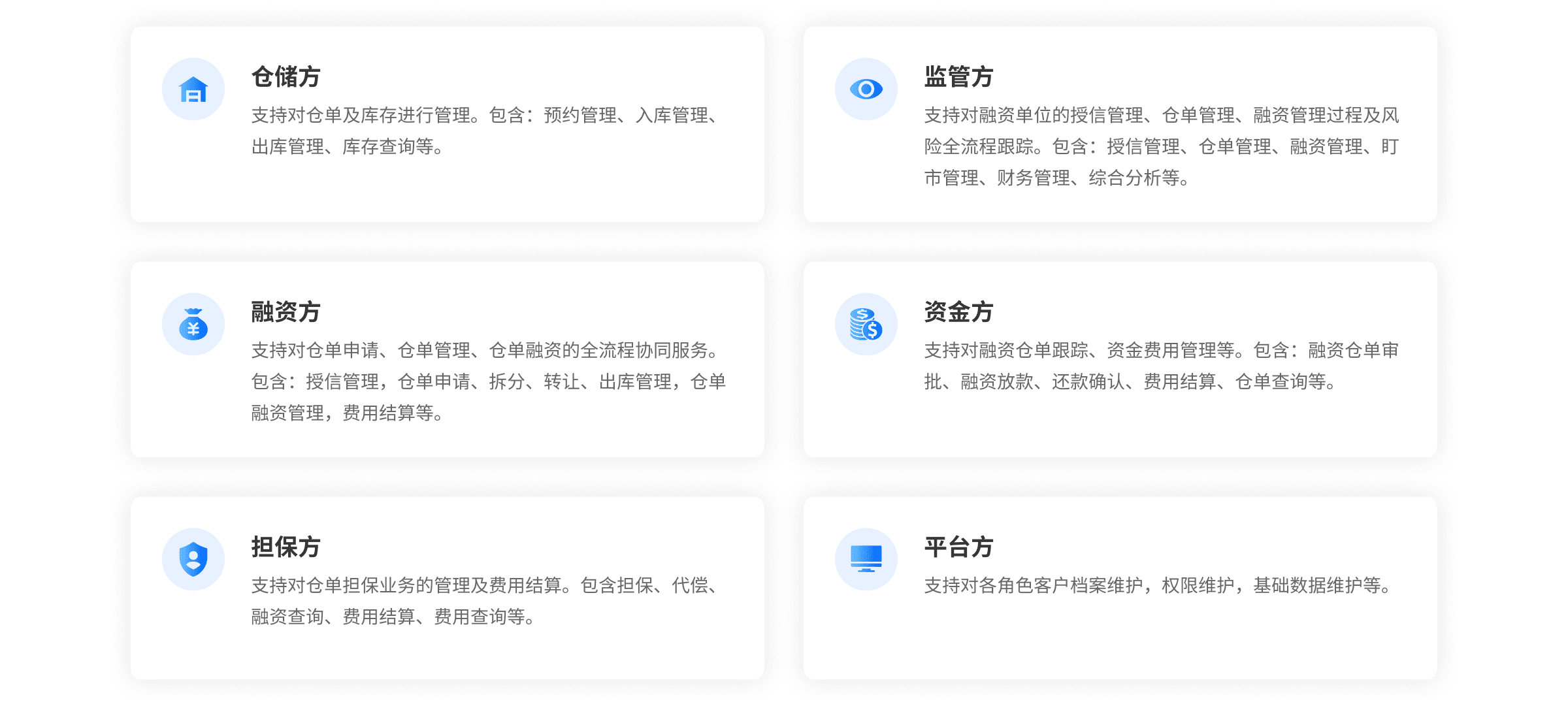 高達(dá)供應(yīng)鏈金融服務(wù)平臺實(shí)現(xiàn)供應(yīng)鏈上下游企業(yè)在線化協(xié)同服務(wù),包含倉儲管理、倉單管理、融資管理、數(shù)據(jù)中心、風(fēng)控管理、平臺支撐等功能,支持與外部倉儲系統(tǒng)、貿(mào)易系統(tǒng)、銀行系統(tǒng)對接,實(shí)現(xiàn)業(yè)務(wù)及數(shù)據(jù)的互聯(lián)互通。