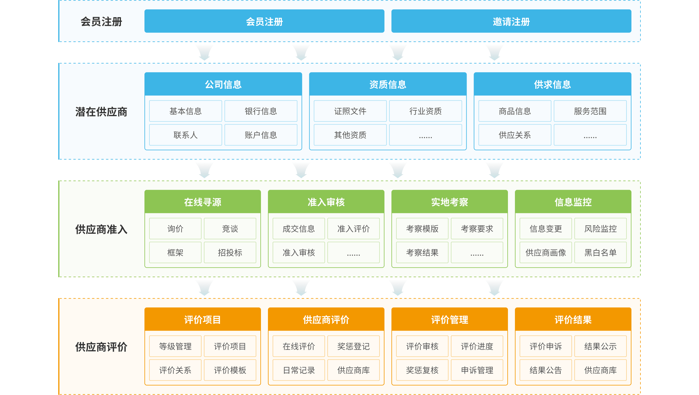 供應(yīng)商管理系統(tǒng)支持供應(yīng)商的注冊、供應(yīng)商的準(zhǔn)入、供應(yīng)商的績效評估、風(fēng)險管理和供應(yīng)商退出的全流程管理。建設(shè)供應(yīng)商信息庫、資質(zhì)庫、業(yè)績庫、價格庫(四庫-一平臺),實現(xiàn)供應(yīng)商生命周期管理;建立標(biāo)準(zhǔn)化的供應(yīng)商管理體系、流程和管理方法,對供應(yīng)商進行有效分層分類,使企業(yè)夠?qū)⒂邢薜馁Y源集中在關(guān)鍵核心的供應(yīng)商上。