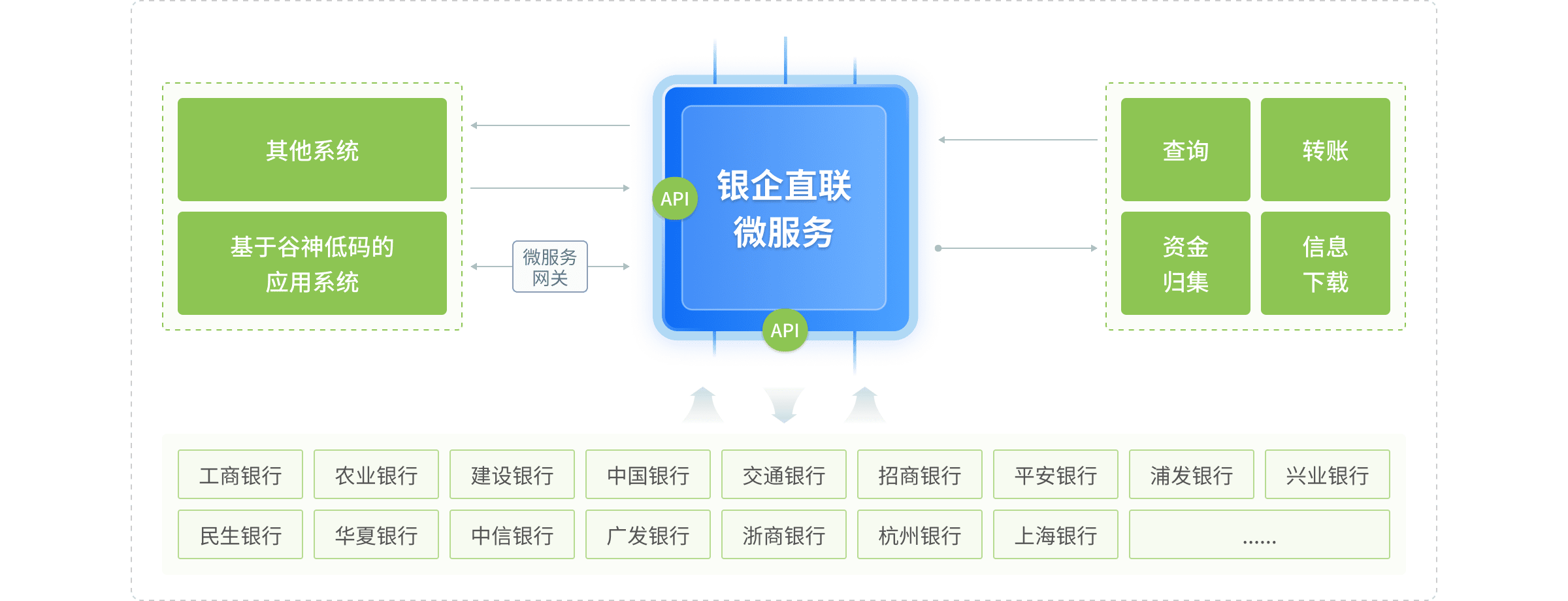 高達(dá)銀企直聯(lián)中臺(tái)隸屬于高達(dá)公共業(yè)務(wù)中臺(tái),采用微服務(wù)技術(shù)構(gòu)建,可獨(dú)立部署使用,提供標(biāo)準(zhǔn)化APIs接口,已接入工農(nóng)建中交、主要全國(guó)性商業(yè)銀行和部分地方銀行,標(biāo)準(zhǔn)化實(shí)施流程,短平快的實(shí)現(xiàn)應(yīng)用效果。