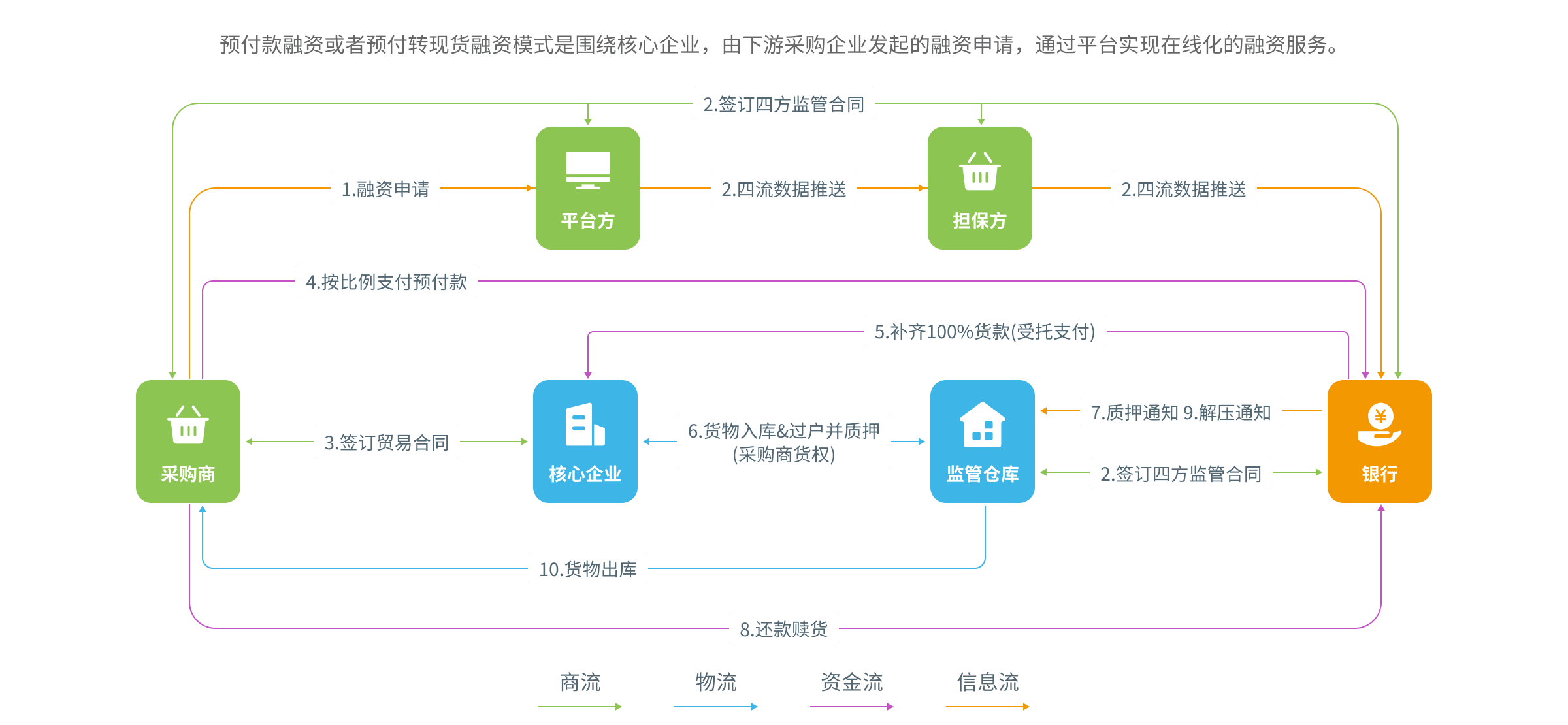 企業(yè)存放貨物在“核心倉(cāng)儲(chǔ)企業(yè)”,銀行給予“核心倉(cāng)儲(chǔ)企業(yè)”一個(gè)額度,在此額度內(nèi),由倉(cāng)儲(chǔ)企業(yè)在“倉(cāng)單通”系統(tǒng)中,開(kāi)具并確認(rèn)“倉(cāng)單”,銀行對(duì)此倉(cāng)單進(jìn)行融資放款;(倉(cāng)單通功能上包括倉(cāng)單交易與倉(cāng)單融資)