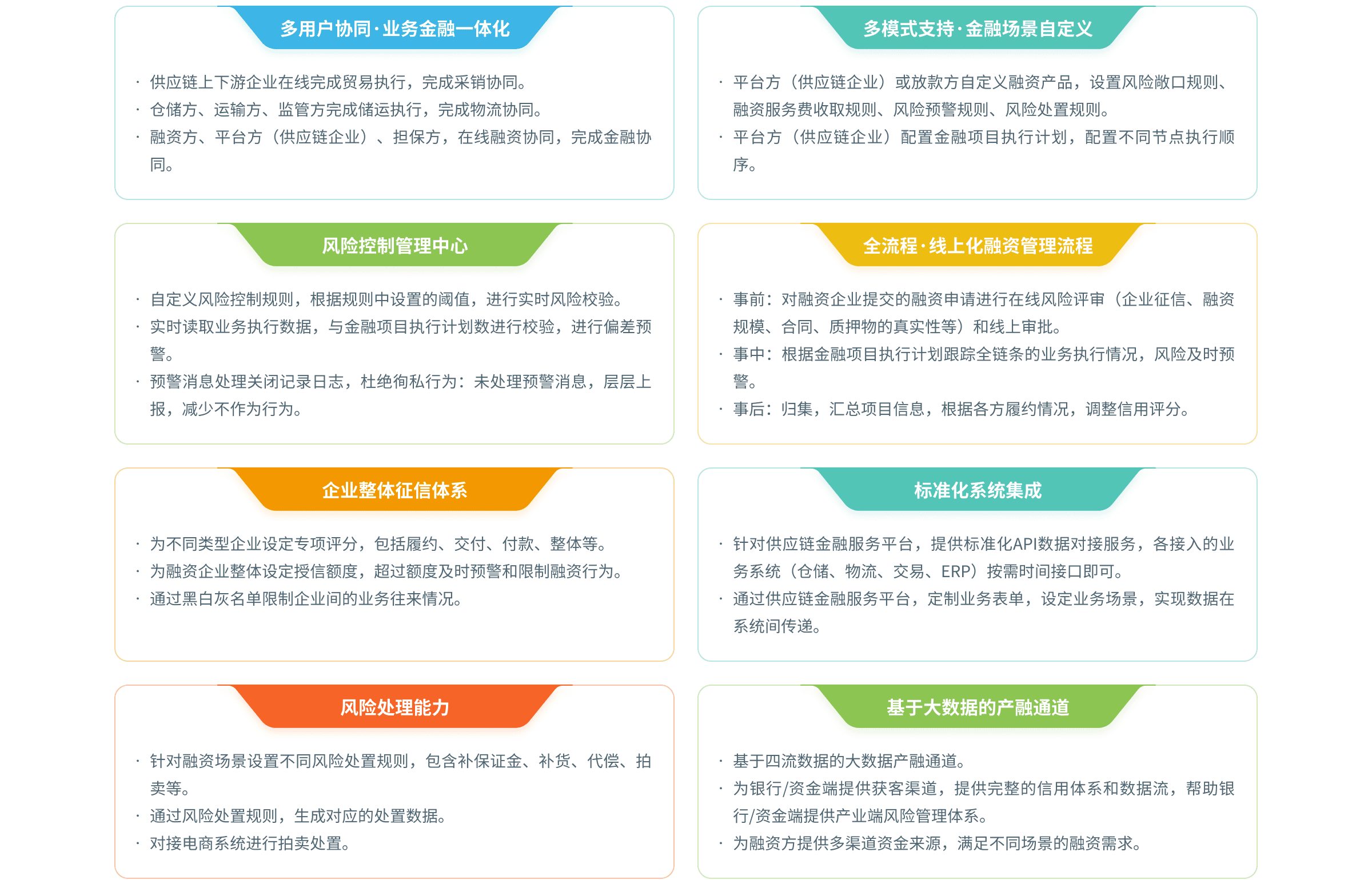 高達(dá)供應(yīng)鏈金融服務(wù)平臺(tái)(預(yù)付轉(zhuǎn)現(xiàn)貨)實(shí)現(xiàn)供應(yīng)鏈上下游企業(yè)在線化協(xié)同服務(wù),包含倉(cāng)儲(chǔ)管理、倉(cāng)單管理、融資過(guò)程管理、風(fēng)控管理、數(shù)據(jù)中心、平臺(tái)運(yùn)營(yíng)支撐等功能,支持與外部倉(cāng)儲(chǔ)系統(tǒng)、貿(mào)易系統(tǒng)、銀行系統(tǒng)對(duì)接,實(shí)現(xiàn)業(yè)務(wù)及數(shù)據(jù)的互聯(lián)互通。