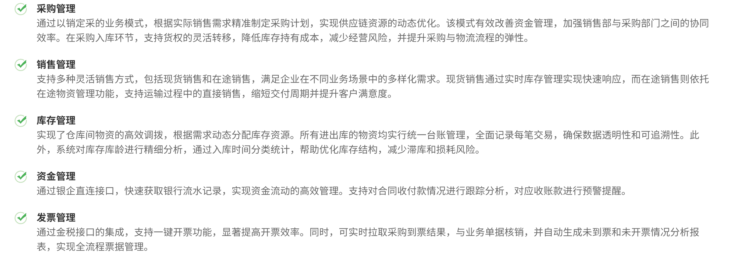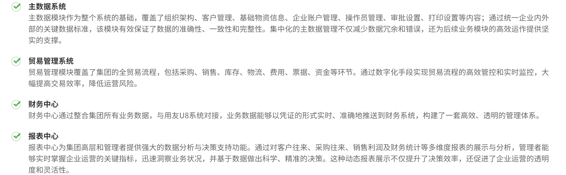 經(jīng)營(yíng)品類:銷售熱軋卷板、冷軋卷板、中厚板、建材、型材、鍍鋅卷板、彩涂卷、酸洗、優(yōu)鋼等,提供完整鋼材供應(yīng)鏈金融、鋼材精細(xì)化加工服務(wù)。展博控股集團(tuán)重點(diǎn)打造了四大核心系統(tǒng)模塊:主數(shù)據(jù)、貿(mào)易管理、財(cái)務(wù)中心和報(bào)表中心。這些模塊的構(gòu)建目的是利用信息技術(shù)和數(shù)字化技術(shù),提高企業(yè)的運(yùn)營(yíng)效率,加強(qiáng)管理效能,并實(shí)現(xiàn)更細(xì)致的管理和智能化的決策過(guò)程。