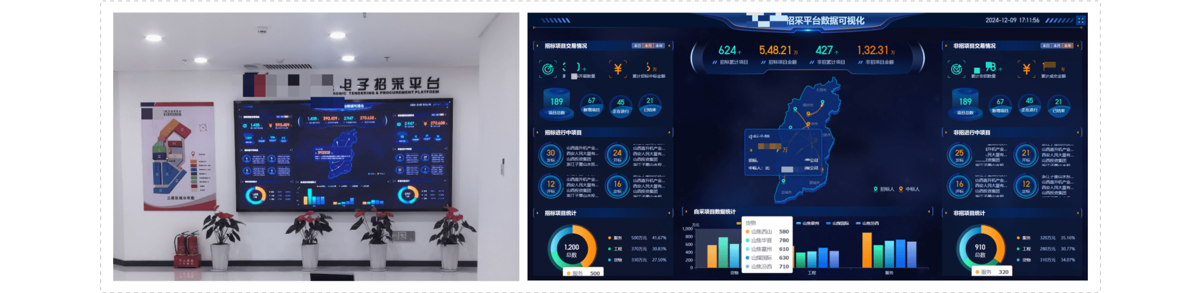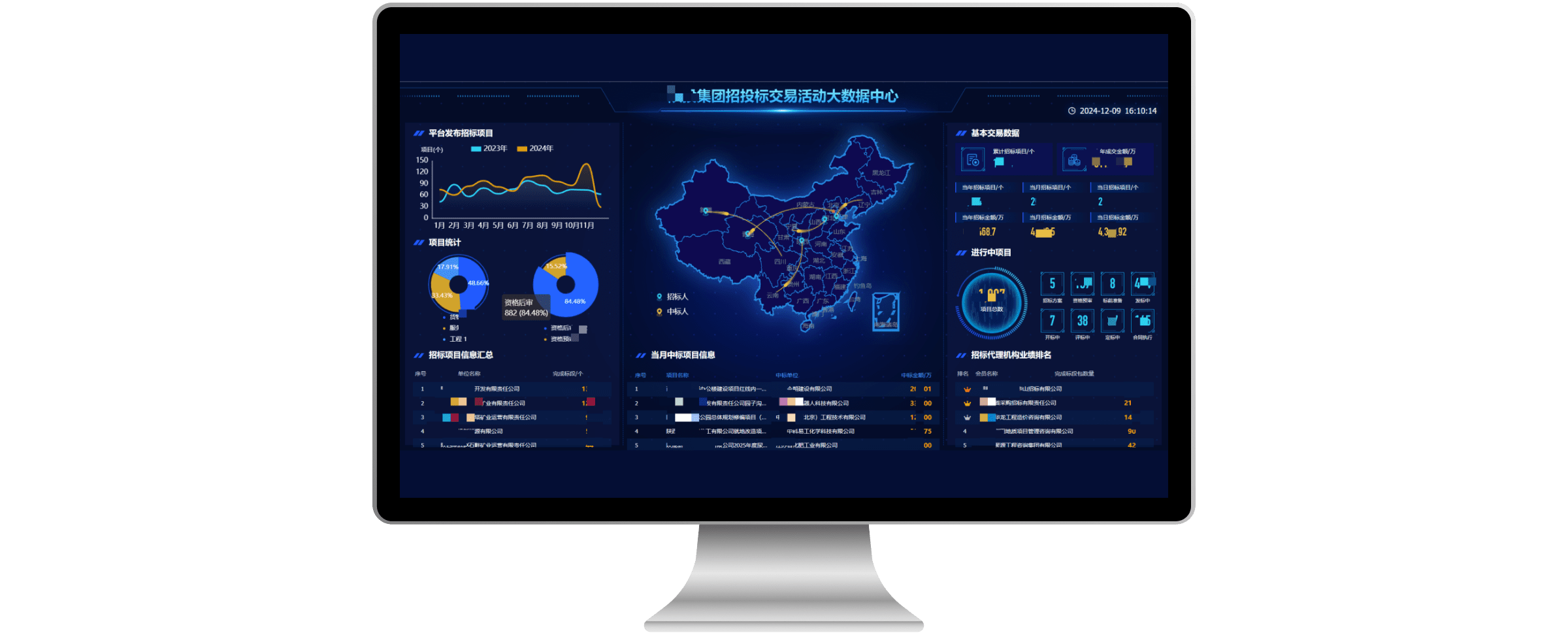 智慧招采數(shù)智決策大屏充分展現(xiàn)了該集團(tuán)電子招采平臺(tái)的核心數(shù)據(jù),全面覆蓋公開(kāi)招標(biāo)與非公開(kāi)招標(biāo)項(xiàng)目的交易統(tǒng)計(jì)情況。同時(shí),該系統(tǒng)對(duì)招標(biāo)與非公開(kāi)招標(biāo)項(xiàng)目實(shí)施實(shí)時(shí)分析與動(dòng)態(tài)跟蹤。通過(guò)數(shù)據(jù)的多維可視化與聯(lián)動(dòng)分析技術(shù),清晰地揭示項(xiàng)目的運(yùn)行狀況與交易金額情況,為管理層提供實(shí)時(shí)掌握招標(biāo)與非公開(kāi)招標(biāo)項(xiàng)目的交易統(tǒng)計(jì)、進(jìn)行中項(xiàng)目及成交金額情況的能力,從而為精準(zhǔn)決策提供有力支撐,有效提升管理效率和透明度。