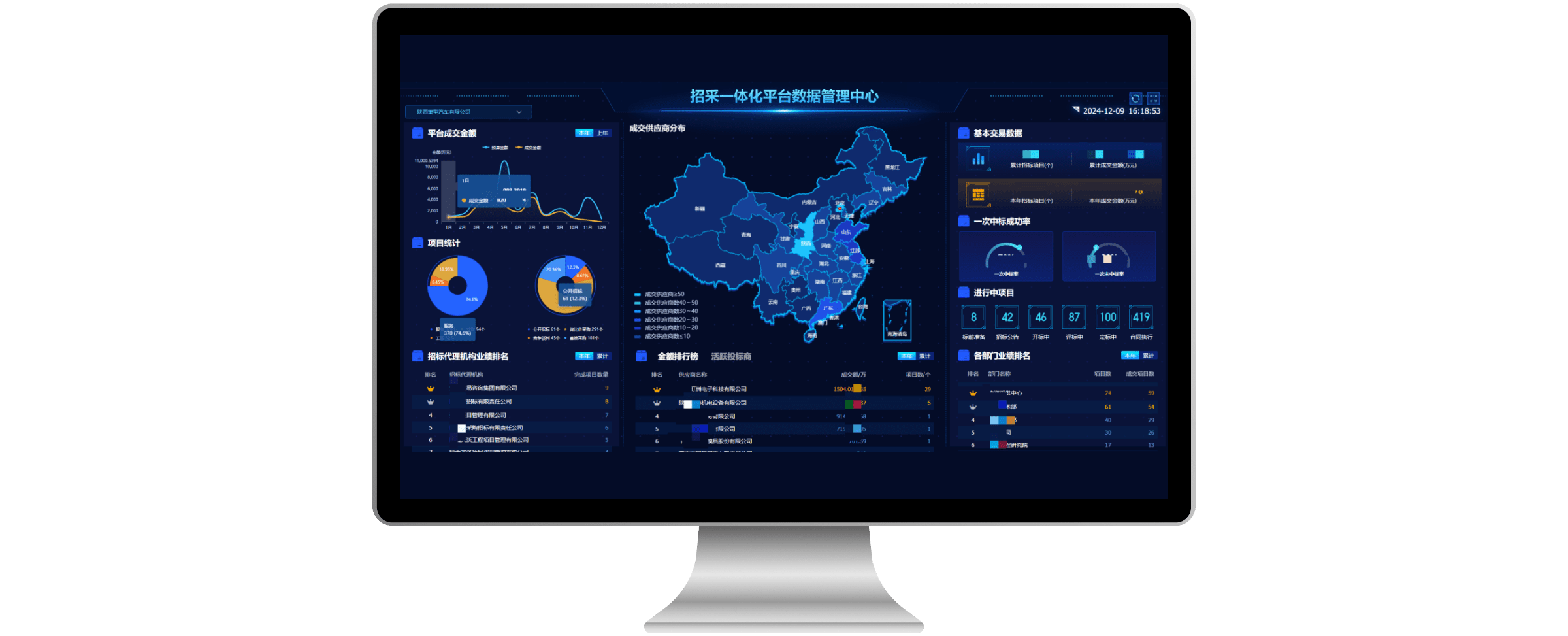 數(shù)字招采數(shù)智決策平臺(tái)全面展現(xiàn)了集團(tuán)招標(biāo)采購(gòu)核心數(shù)據(jù),內(nèi)容包括平臺(tái)成交金額、成交供應(yīng)商分布、項(xiàng)目統(tǒng)計(jì)、代理業(yè)績(jī)排名、基本交易數(shù)據(jù)、一次中標(biāo)成功率、進(jìn)行中項(xiàng)目以及各部門業(yè)績(jī)排名等多個(gè)維度。通過(guò)數(shù)據(jù)的多維可視化和聯(lián)動(dòng)分析,大屏清晰地呈現(xiàn)各業(yè)務(wù)板塊的運(yùn)行狀況,助力管理層實(shí)時(shí)掌握招標(biāo)采購(gòu)相關(guān)數(shù)據(jù),從而精準(zhǔn)評(píng)估業(yè)務(wù)進(jìn)展。