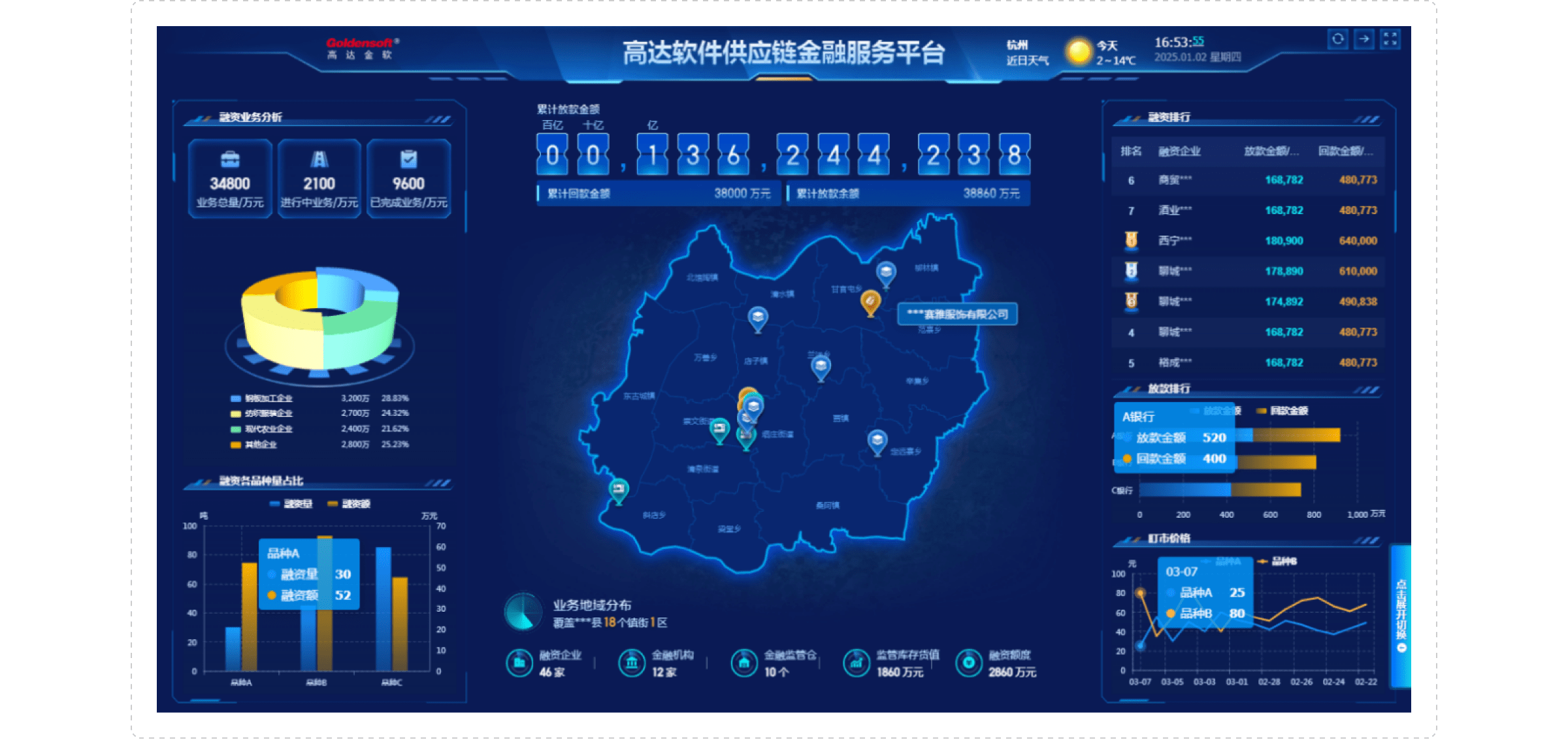 提供在線供應(yīng)鏈金融服務(wù)業(yè)務(wù)看板,展示核心業(yè)務(wù)指標(biāo),包括融資總額、在貸余額、當(dāng)日放款金額等;同時(shí)呈現(xiàn)企業(yè)業(yè)務(wù)關(guān)鍵信息,例如產(chǎn)業(yè)地圖、金融機(jī)構(gòu)接入情況、融資企業(yè)地域及監(jiān)管情況、分模式業(yè)務(wù)量展示、企業(yè)融資及銀行放款排行、價(jià)格盯市等。通過全方位、多角度的集中業(yè)務(wù)展示,為客戶提供高效能的業(yè)務(wù)管理和決策支持。
