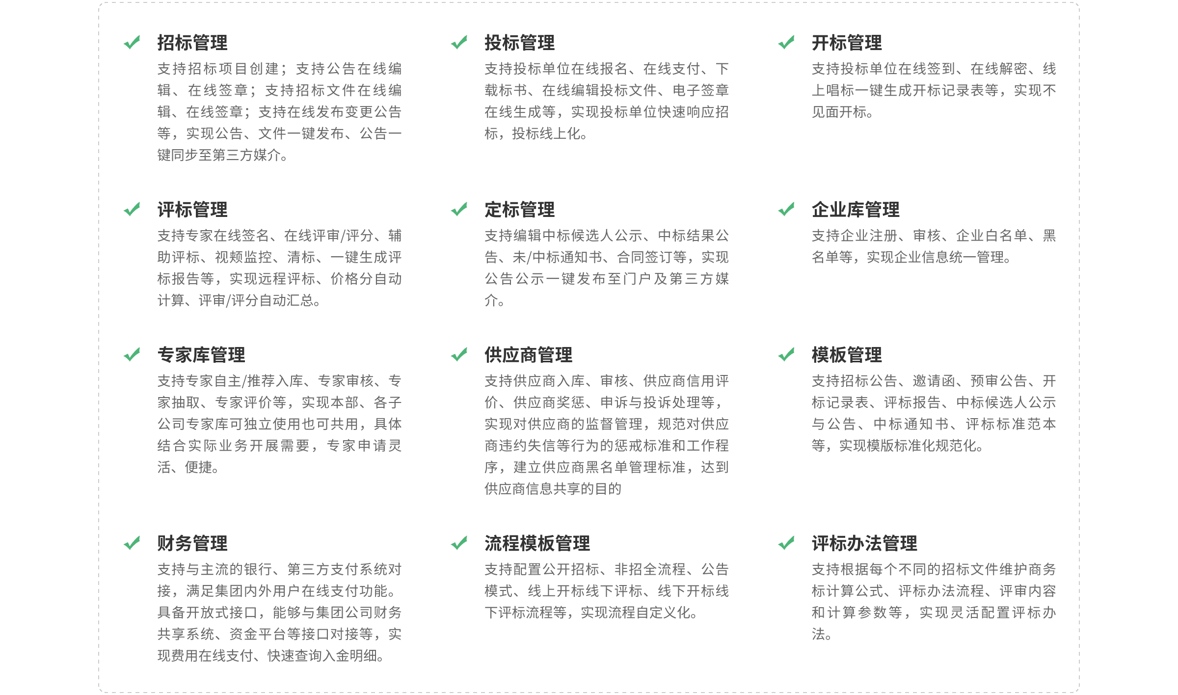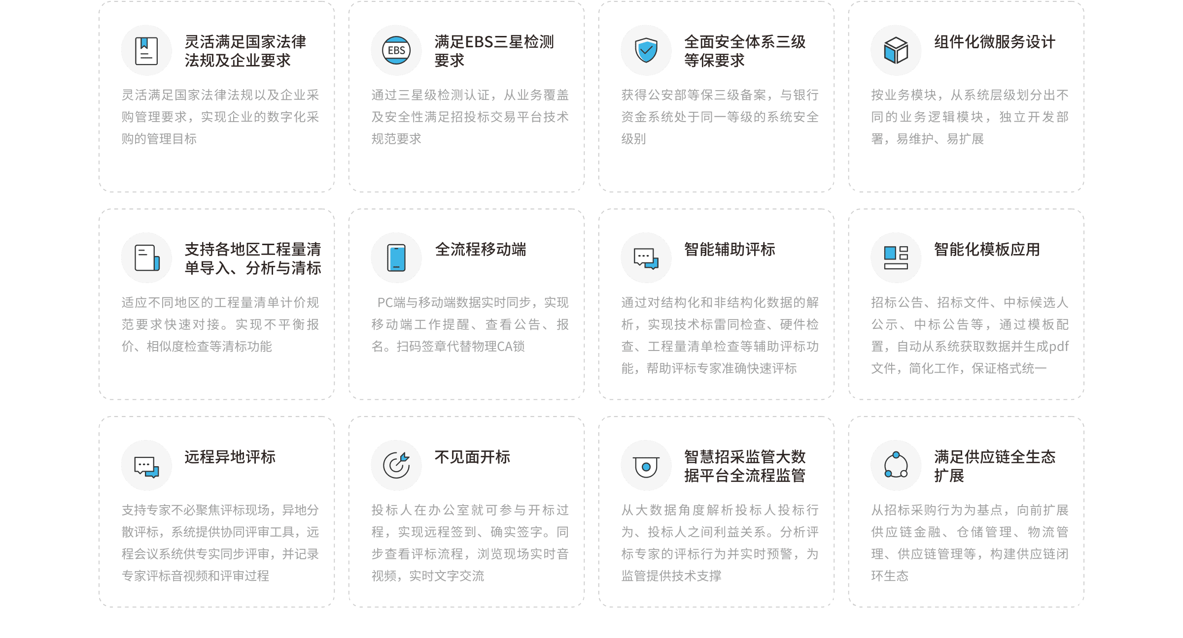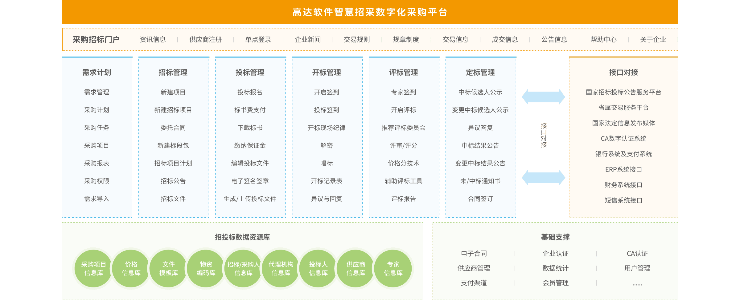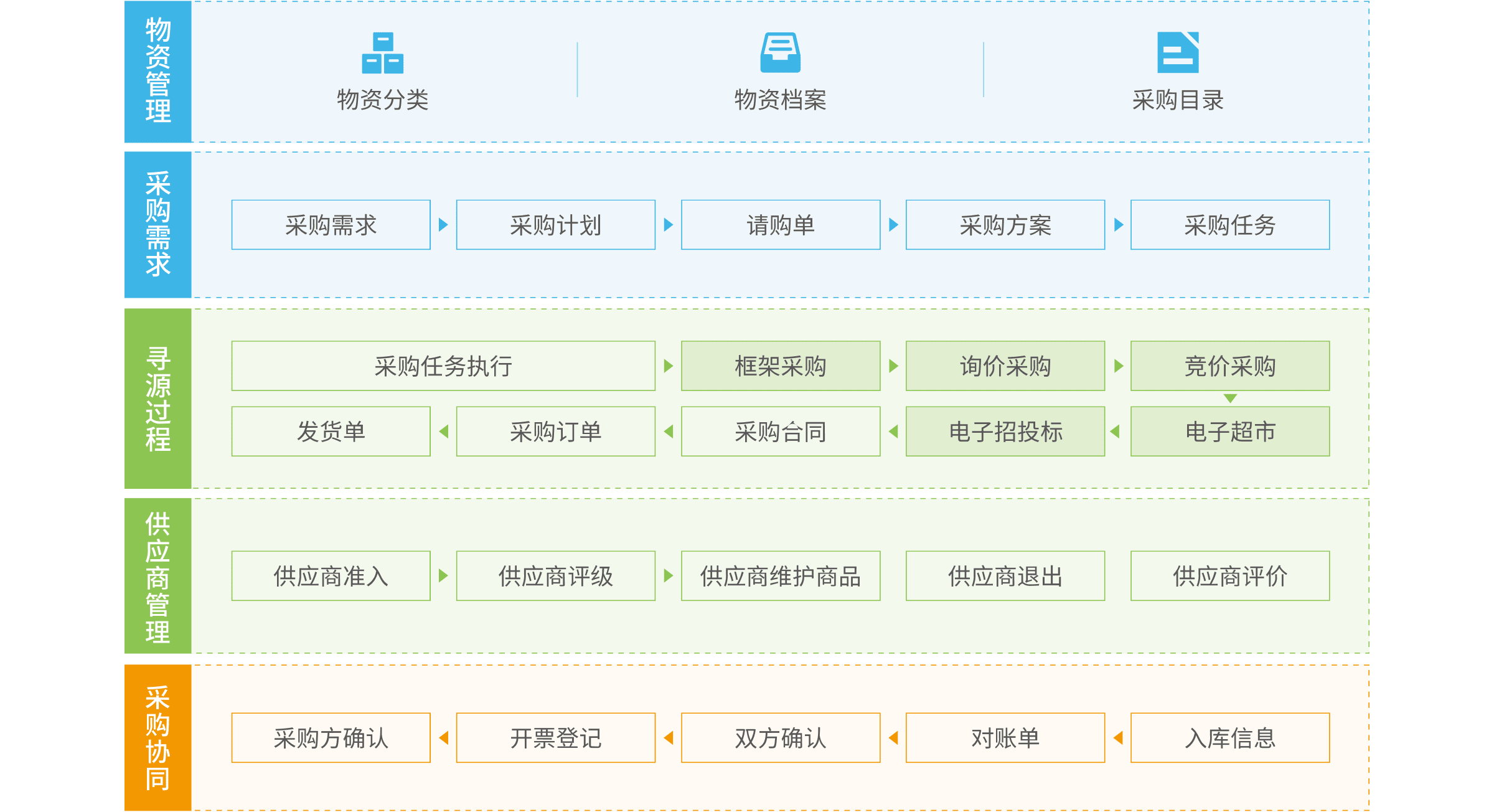 業(yè)務(wù)功能全覆蓋:供應(yīng)商管理、需求提報(bào)管理、集采管理(電子招投標(biāo)、商品詢價(jià)、服務(wù)詢價(jià)、框架協(xié)議采購、競爭性談判采購、競價(jià)采購、網(wǎng)上超市、廢舊物資處置)、合同管理、審計(jì)監(jiān)察、大數(shù)據(jù)分析、云倉儲(chǔ)、云物流平臺(tái)等功能。