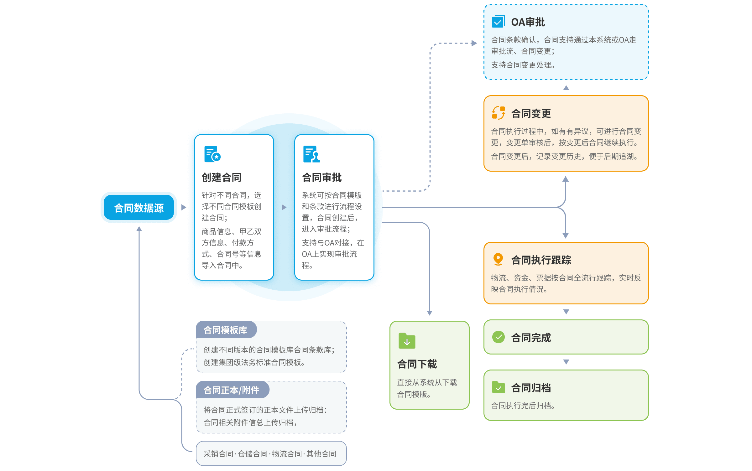 高達(dá)合同中心基于微服務(wù)架構(gòu)精心構(gòu)建,實(shí)現(xiàn)中臺(tái)數(shù)據(jù)高度統(tǒng)一集中管理、降低業(yè)務(wù)與管理、風(fēng)控的耦合程度,以合同為主線進(jìn)行智能化管理,結(jié)合多類型合同數(shù)據(jù)來源、合同審核、業(yè)務(wù)卷宗查詢、合同報(bào)表分析等方向來搭建合同中心,以合同關(guān)鍵元素、合同條款、合同模板等作為輔助項(xiàng),支持自定義審批流程、移動(dòng)審批、對(duì)接OA審批,多維度提升合同綜合管控能力。